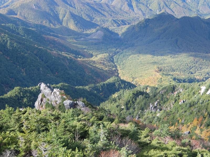 黄金に輝く森と白い巨岩 秋の金峰山