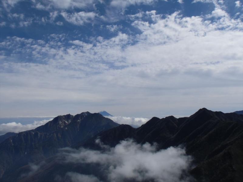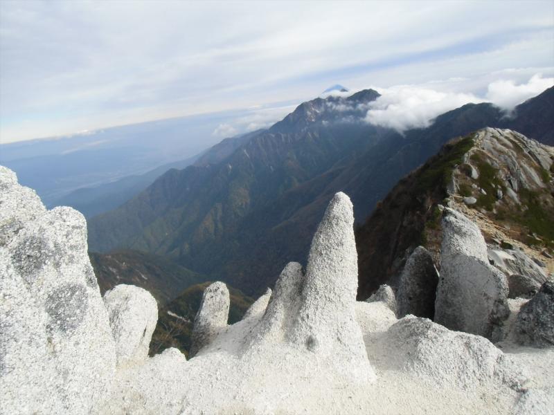 仙水峠では仙丈ケ岳はもちろんですが、鳳凰三山、その奥に富士山が見えてきます。