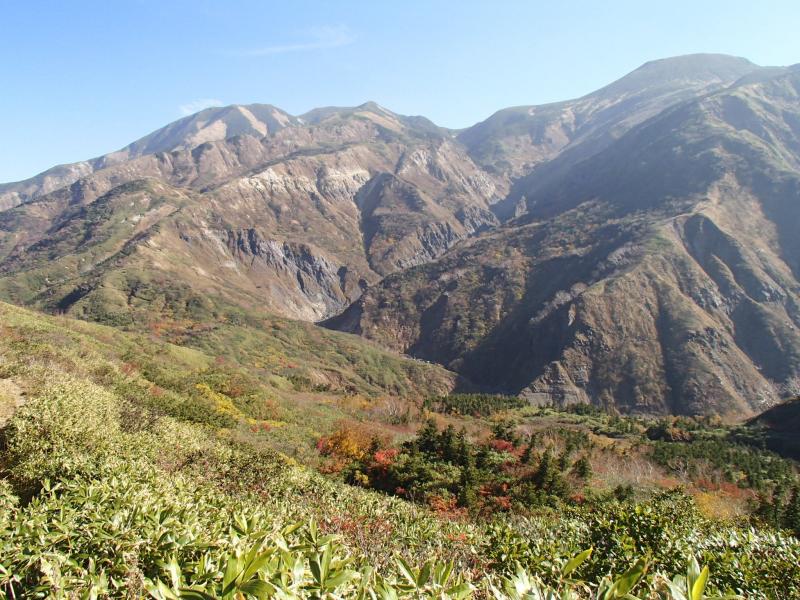 釈迦岳までは紅葉も終盤、落葉が始まり登山道が赤や黄色の葉で覆われています。七倉の辻手前の雪もかなり少なくなっていますが日影部分に残っているものは凍っているので油断できません。御手水鉢から大汝峰までのハイマツ帯の登山道は凍った雪に覆われているのでアイゼンがあると安全快適でした(下りにこのルートを使う方は必携)。お池方面から御前ヶ峰までのルートも同様、凍った雪が光っていました。