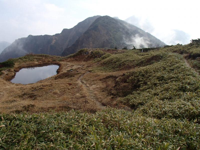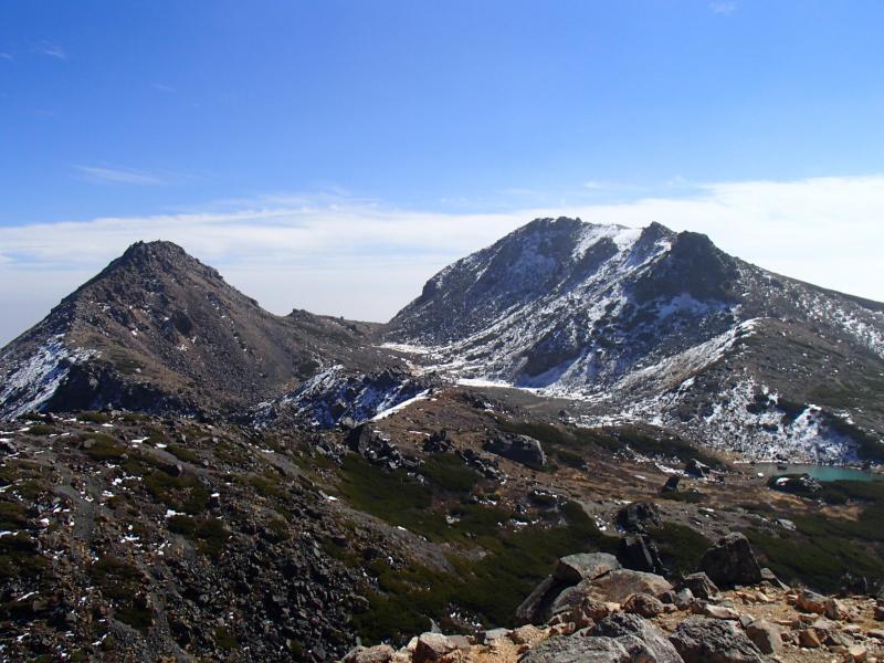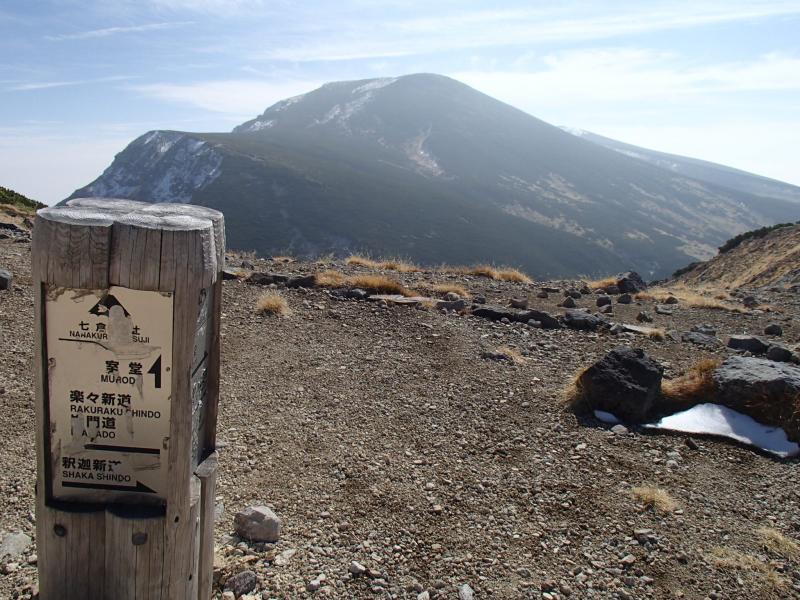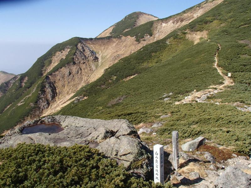 - 初冠雪時の雪は随分と減っています。ハイマツの影になっている箇所や、白山山頂付近では東面側(池側)の雪は氷化しているので注意が必要です。紅葉も盛りを過ぎ、落葉が始まって登山道の表面が葉っぱに覆われています。隠れている岩、木の根に注意です。