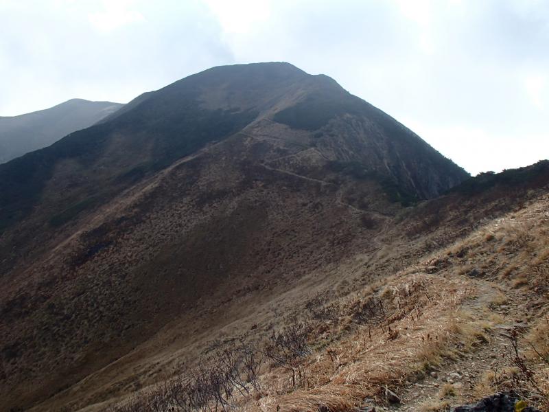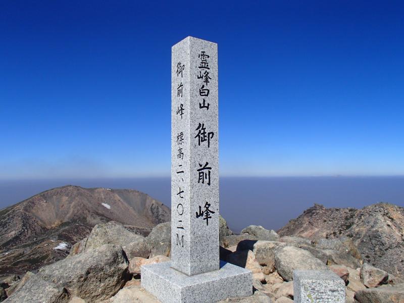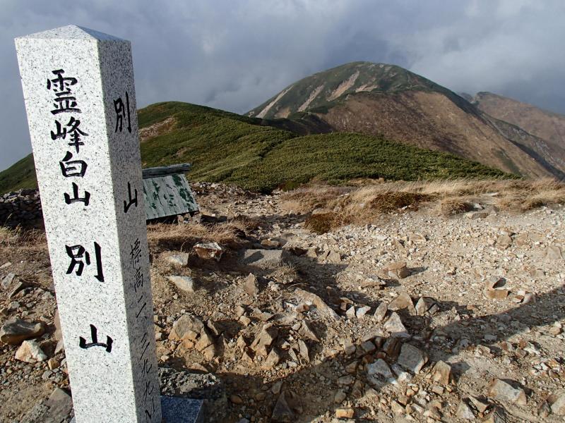 快晴の御前ヶ峰をあとに先を急ぎます。油坂の急登をなんとかこなして稜線にでると別山に続くルートが一望できます。左側が切れている箇所も多いので強風時は注意が必要です。夏場はとにかく水分という感じですが、この時期ガスと強風の中ではポットの温かい飲み物が心も体も落ち着かせます。ようやく別山に到着した頃には御前ヶ峰方面は雲の中。後は無事に日没までに下山するだけと、山々に感謝し気合を入れて歩きます。チブリ尾根も落葉が進んでおり(ゆっくり歩くとその美しさを楽しめるはずですが)登山道は赤や黄色に覆われていました。秋の白山の峰々を堪能できた一日でした。