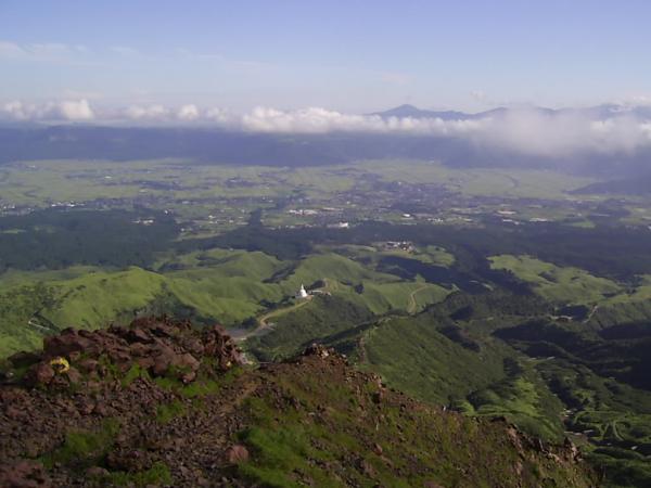 本来はロープウェイ経由が主なのか、刈り払いはされているけれどもやや低木が道を遮る。ミヤマキリシマらしきものもいっぱいあったがもちろん季節外れ。すぐに森林限界を越え、火山岩の道を登る。結構デコボコなのだが、しっかり固まっているので比較的安心。でもやはり足首を守る靴が良いだろう。振り返ると阿蘇の町並みとその先の外輪山の台地、さらにその先には九重連山、贅沢だ。グイグイ(ゆっくり)登り、快適登山。