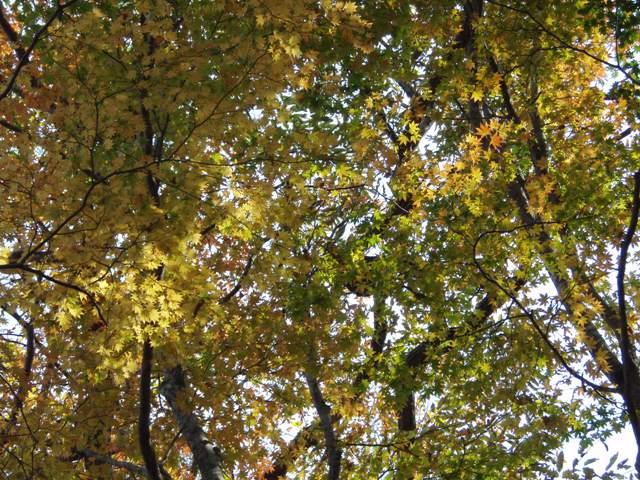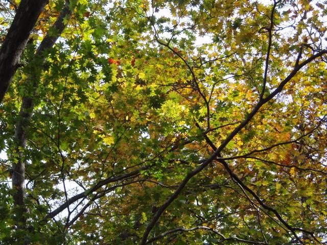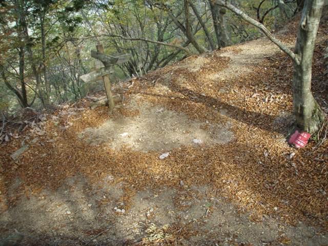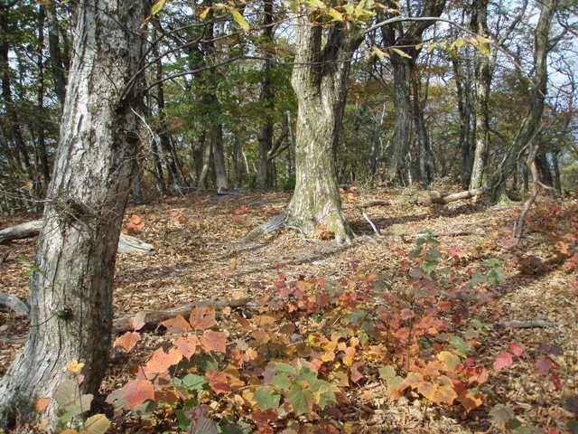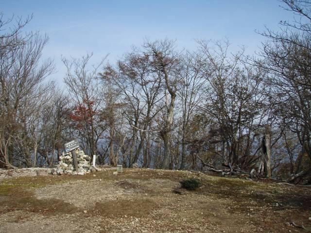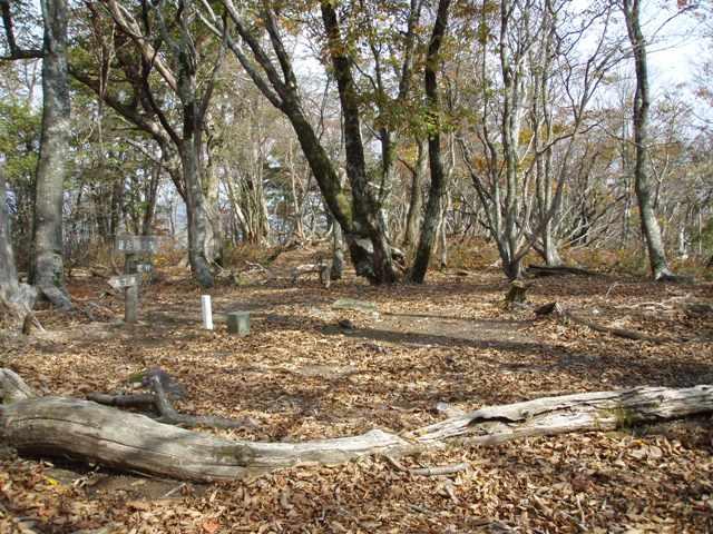 「ぶな平」からは落ち葉の積もった適度な傾斜の快適な尾根道歩きが続きます。約100分で鎌倉山の山頂に到着。三角点あり、展望は木立の隙間に少しあり。気温10度。尾根道は風が強くて立ち止まると寒いですが、歩行時は撥水アンダーウェアとウール中厚手のシャツが快適でした。