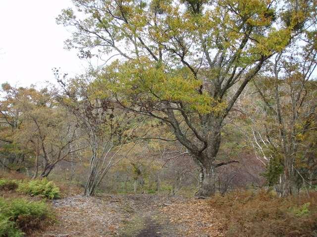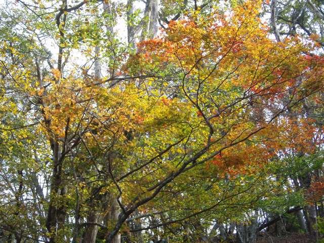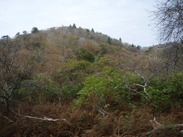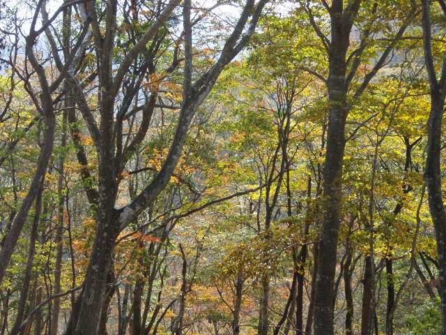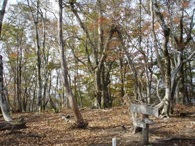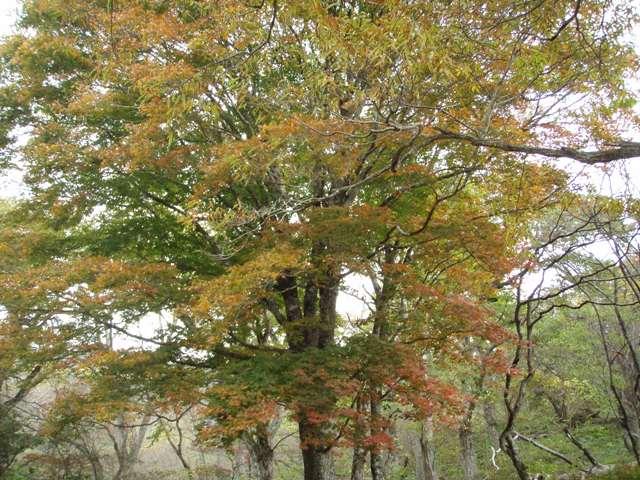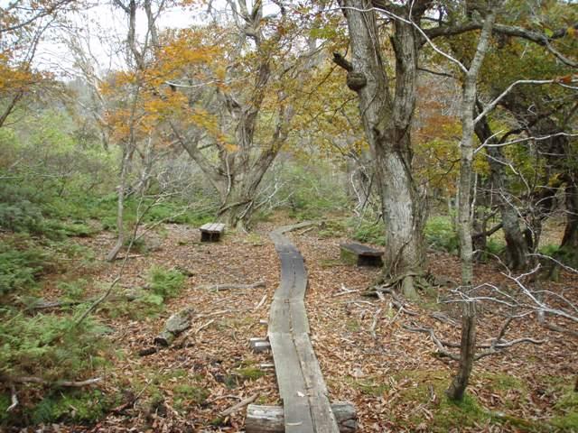小ピークを越すための急なアップダウンを幾度か繰り返すとオグロ坂峠に到着。この尾根道沿いは紅葉が丁度見頃を迎えていました。八丁平湿原の周回コースを時計まわりに進んで、紅葉が見頃を迎えつつあるクラガリ谷からのルートで峰床山へ到着。三角点あり、西方向に展望あり。気温12度。吹きさらしで結構寒い。