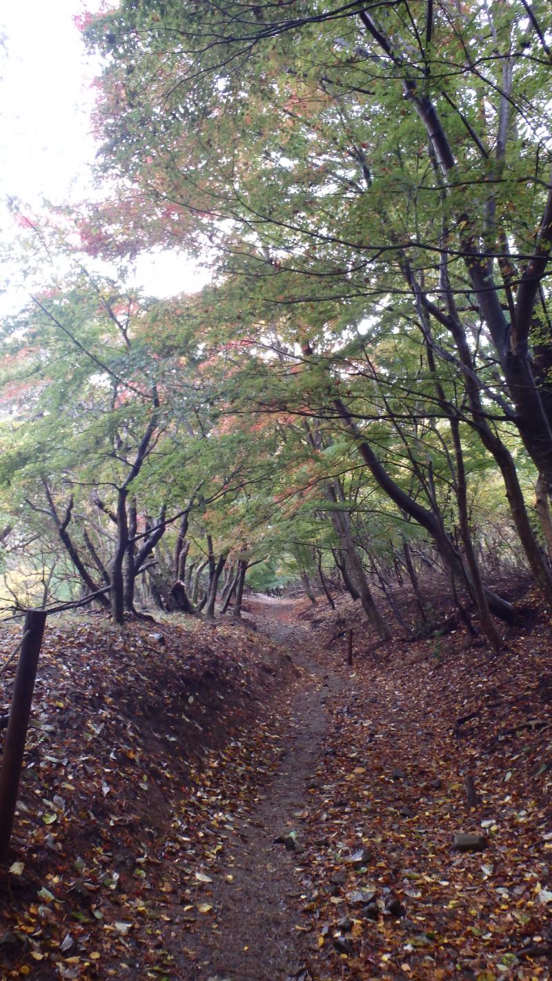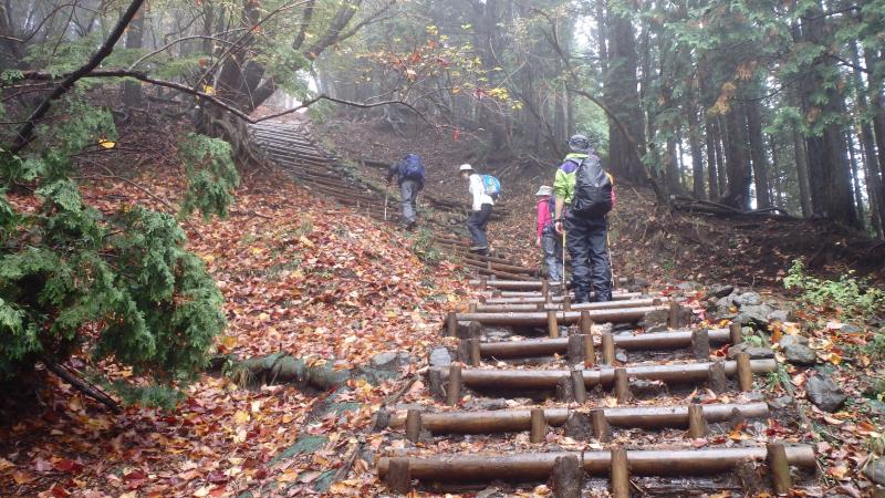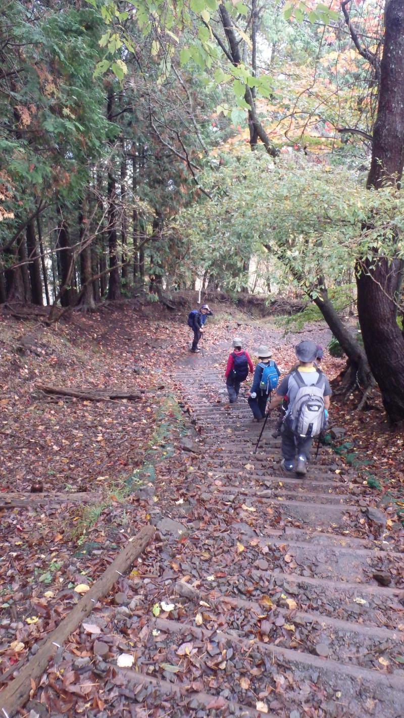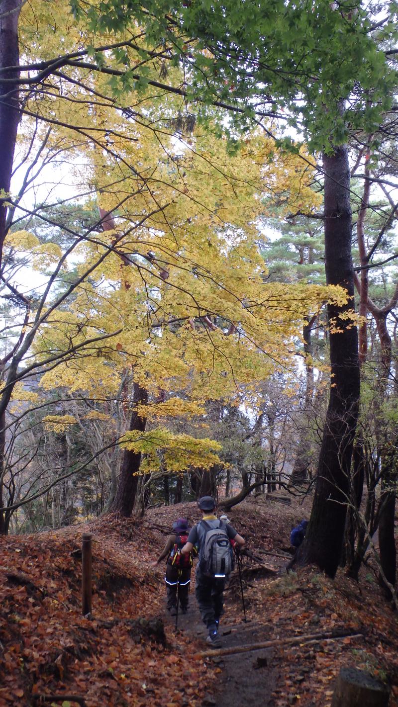 紅葉も終盤で登山道に積もった落ち葉を踏みしめながら登り、中腹のもみじが所々色づいており綺麗でした。