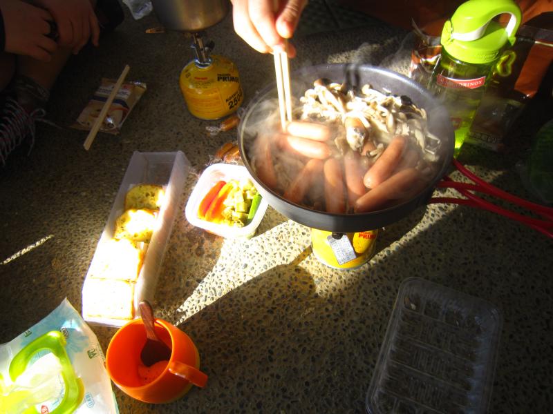 今回は秋の味覚ということでキノコとソーセージのソテー!各自持ち寄った手作りピクルスやサツマイモパウンドケーキ、モツ煮などでのんびり食事。