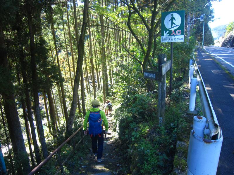 軍畑駅を下車し正面の坂を下ります。突き当りの道路を右に曲がって歩いて暫くすると、御岳渓谷遊歩道入口が左手に見えてきます。