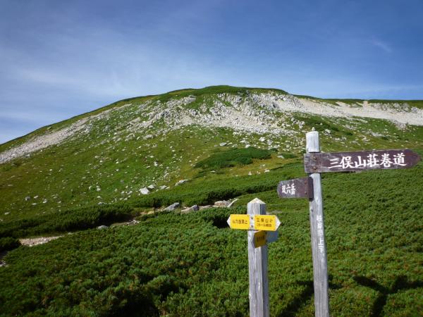 双六岳からはピークハントできる「稜線ルート」、やや下を通る「中道ルート」、高低差が少なく最短の「巻道ルート」が選べます。どこを選んでも槍・穂高の眺めは最高!ただし巻道ルートは双六岳のみならず三俣蓮華岳の山頂も通りません。残雪期には迷いそう。三俣山荘はこの高さにありながらテント場の周りを小さな沢が流れています。この山域は本当に水が豊富だ。