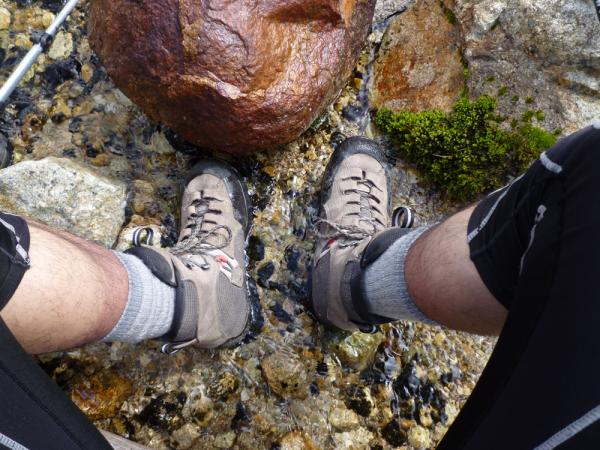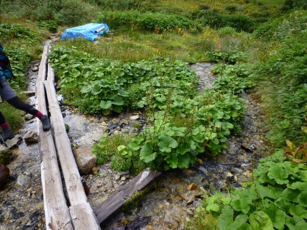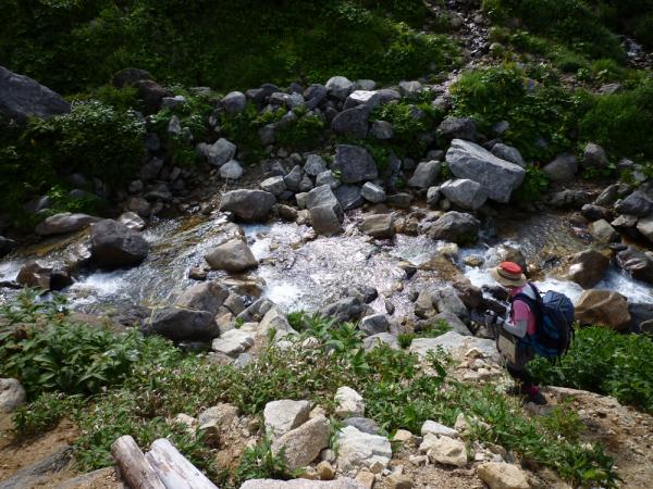 雲ノ平はギリシャ庭園、アラスカ庭園、スイス庭園など8つの庭園名称がつけられた高山植物の群落地を持つ日本で最も高いところにある溶岩台地です。本当は丸一日散策して歩きたいくらい。黒部川の源流へは祖父岳を左に見ながらグングン下降。豊富な水量(ちょっと徒渉を躊躇うほど)の沢を渡ったところに石碑が建っています。しかし沢はさらに上方の鷲羽岳方面から流れていますし、右上の三俣蓮華岳方面からも沢は流れてきています。本当の源流は…と思ってしまいますが、それでもここがあの黒部川の源流かと思えば感慨深いもの。