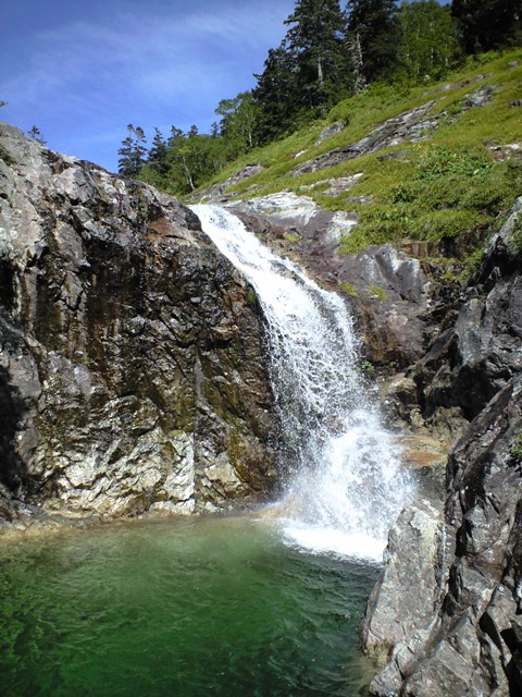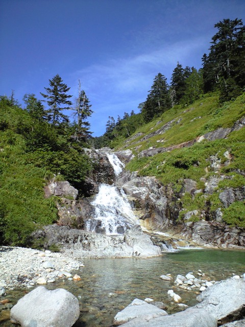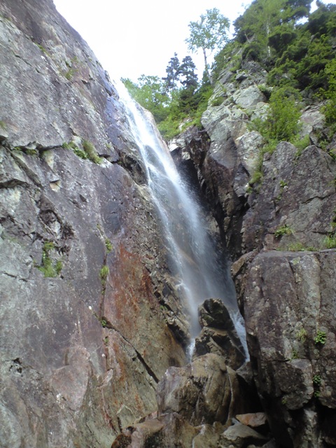 - 薬師沢小屋から赤木沢出合まで、上流に向って右岸を数箇所、高巻きをします。赤木沢に入ってから快適な沢登りが楽しめます。経験者ならロープなど出さずすすめるでしょう。初心者がいる場合はロープでのフォローが必要になります。天候が崩れると、増水しますので天候の見極めも必要となります。沢の終わりから稜線までのルートファインディングが必要です。ミスればハイマツの藪コギとなります。上部の踏み跡は期待しないでください。