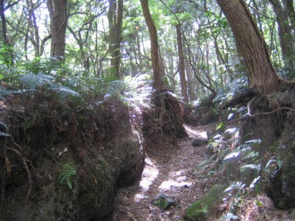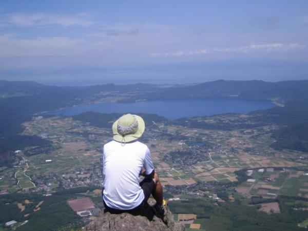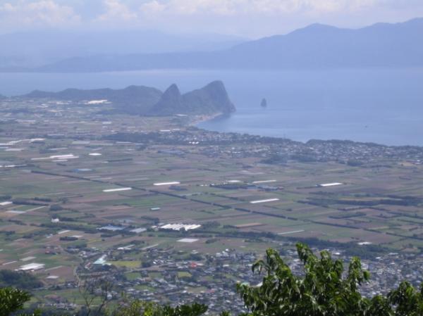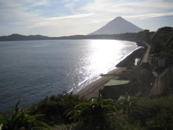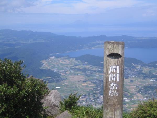 標高の低さから百名山とはいえ楽勝気分でしたが、大阪・神戸にある六甲山同様、ほぼ0mから登る正味の標高は意外に疲れました。登山道は一本しかなく、延々と単調な登りでしたが、時折出てくる海側の展望は感嘆の風景です。本当に晴れててよかった。山頂からの展望は文句の付けようがなく、屋久島まで遠望できるほどで、桜島が上げる噴煙もはっきりと見て取れる程でした。