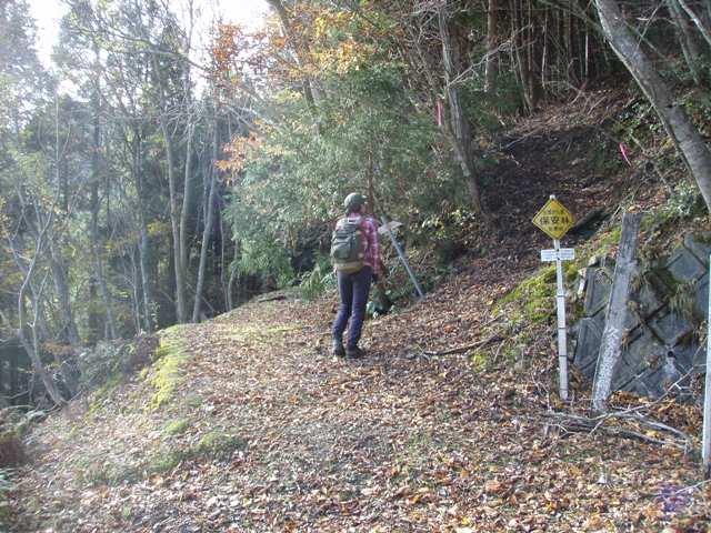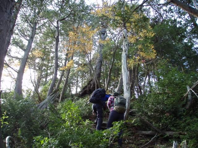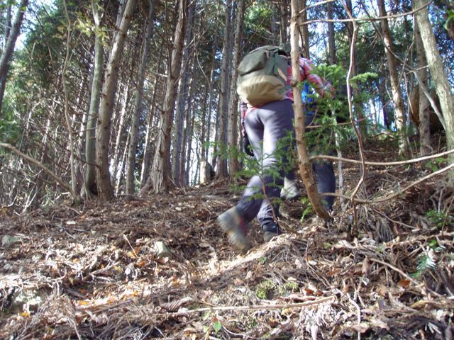久多峠の登山口から入山。登山口には特に標識などはありませんが、急斜面を登っていく道が桑谷山への登山道です。紅葉はごく一部の樹木に残っているのみで、ほとんど落ちていました。