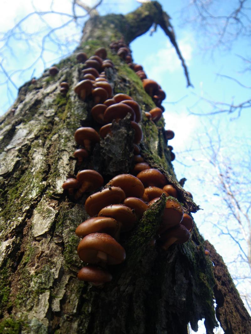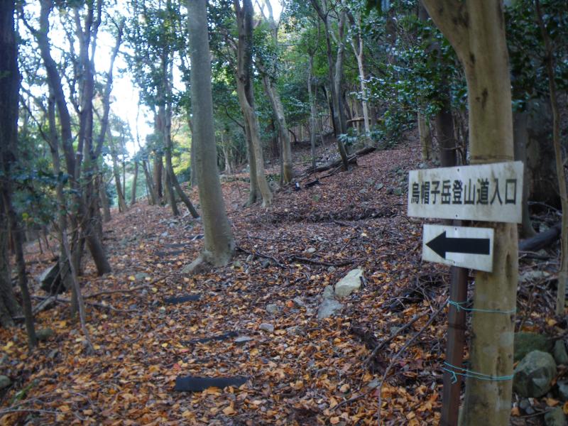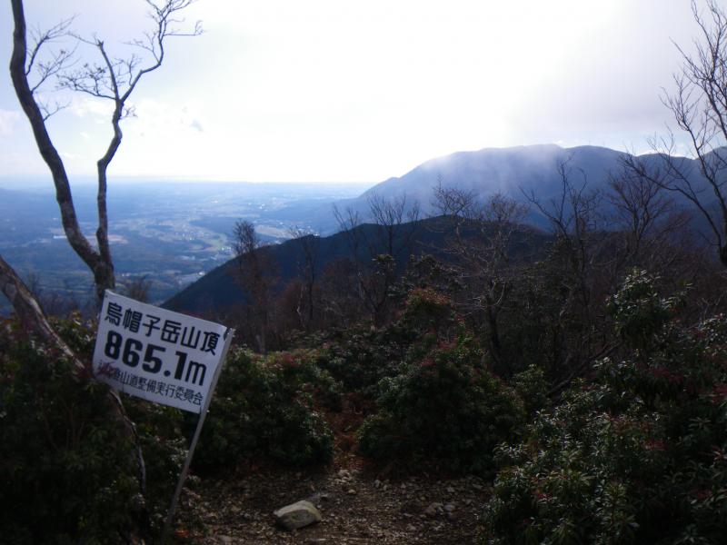春には山頂付近の登山道でイワウチワやカタクリやホンシャクナゲが見られるそうですが、今の時期はさすがに冬枯れした光景にポツリポツリとナメコの群生が見られます。烏帽子岳へはこの時山コース(西北尾根)と細野コースが主で、西北尾根は送電線巡視路の一部を通過するため、急坂ですが整備が行き届いていました。途中で霊仙山がきれいに見えましたが、なんとなく雪化粧している感じで、そちらの雲がこちらに早々と向かってきて、頂上手前ではいよいよ強風と共に小雪がちらつき、さすがに寒い一日でした。