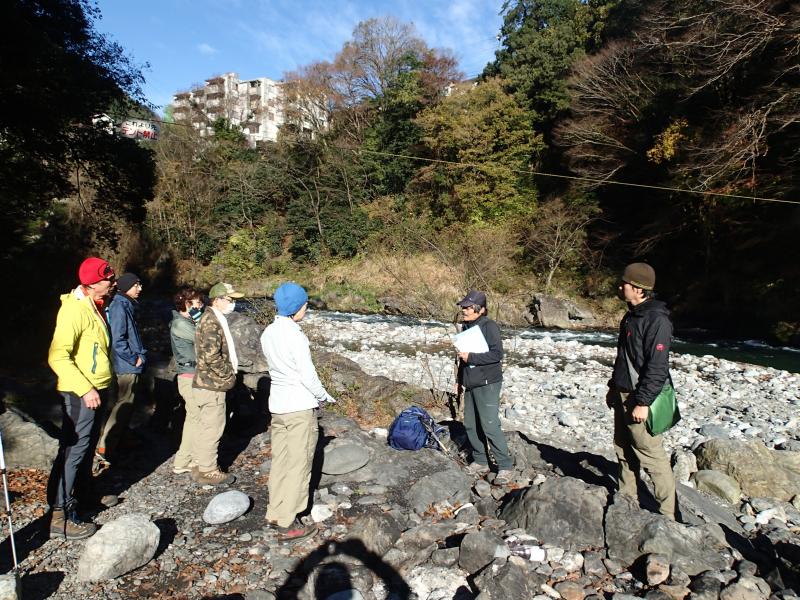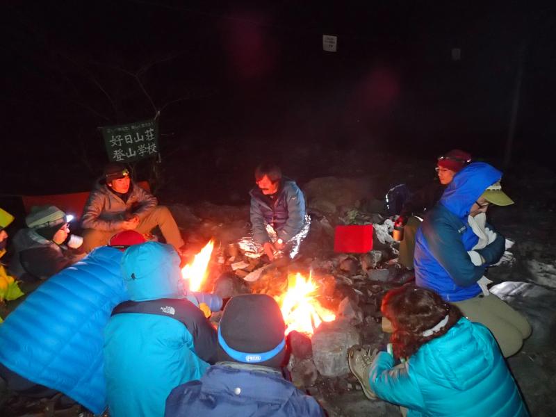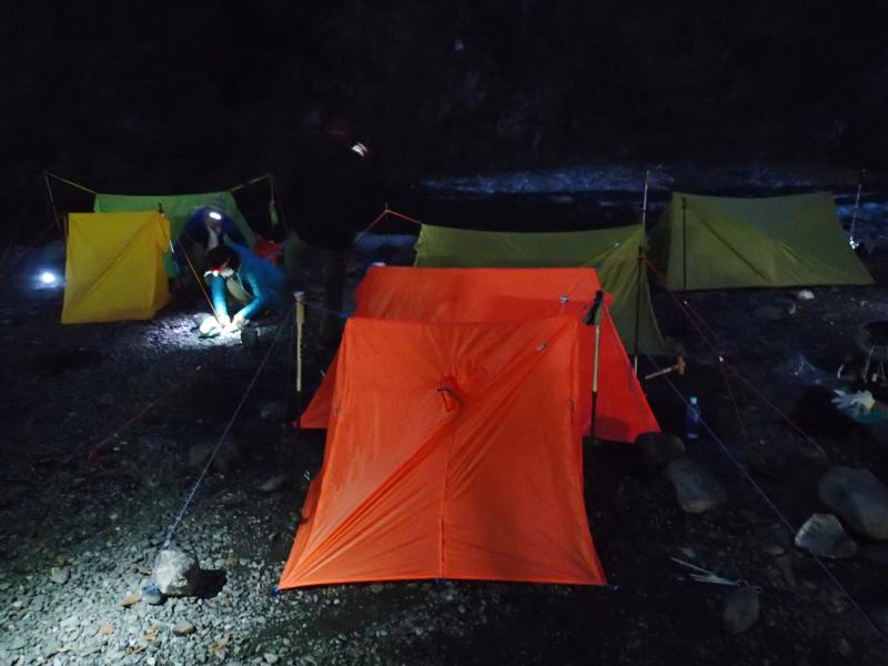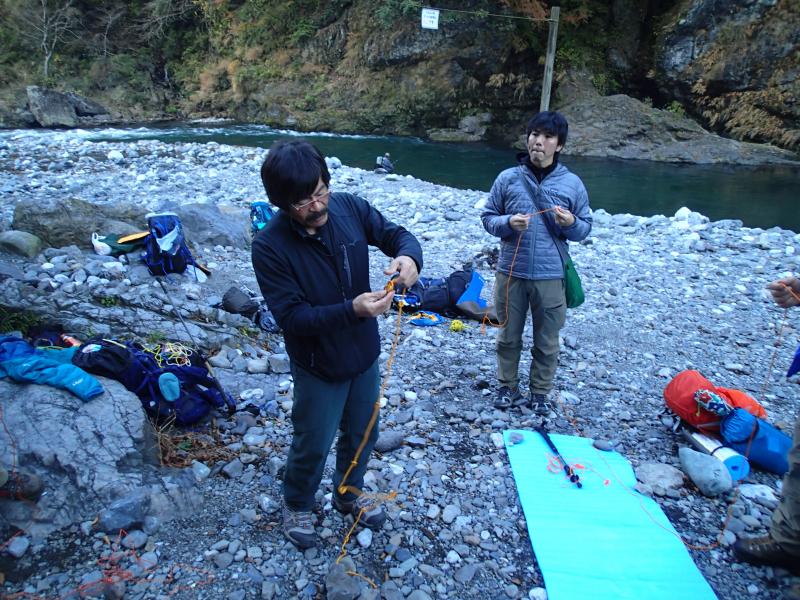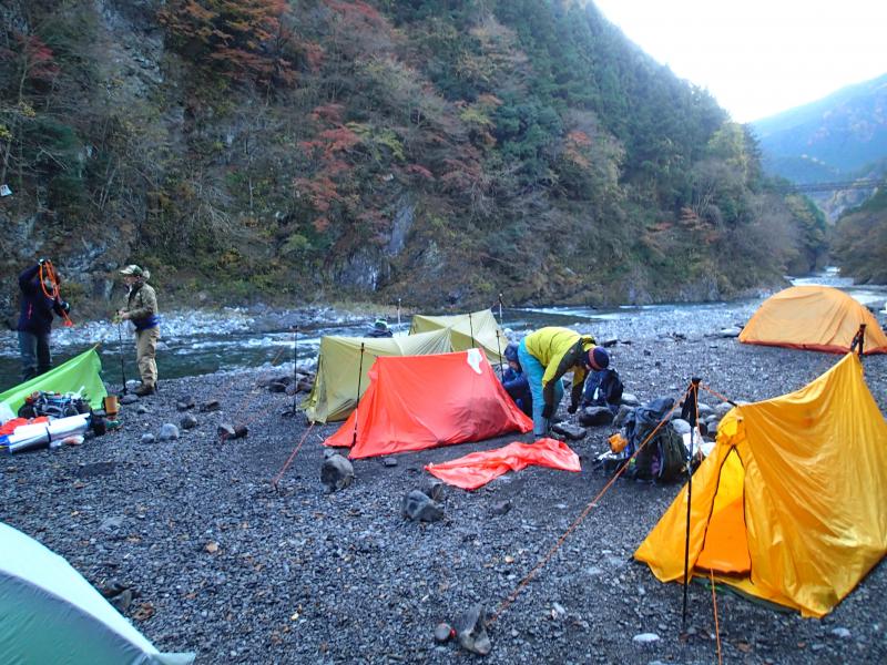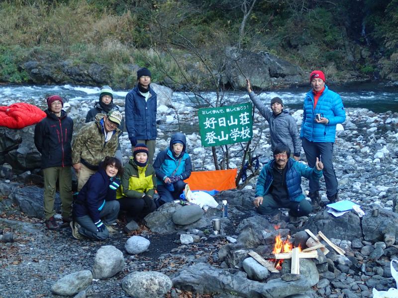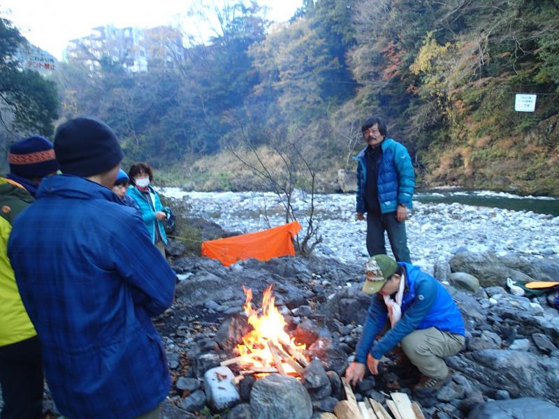 11月の結構寒いさなかでも、人気のキャンプ場は人がいっぱい。端っこの方でツェルトを張るだけでなく色々使えるロープワーク等の講習・練習をし、各自ツェルトを張りました。皆様初めての割に上手に張れました。暗くなり、焚火を囲んで講義の続き。その後各々夕食を用意し、まったりと食事をしながら経験豊富な大蔵ガイドのお話を聞かせていただき、有意義な夜を過ごしました。