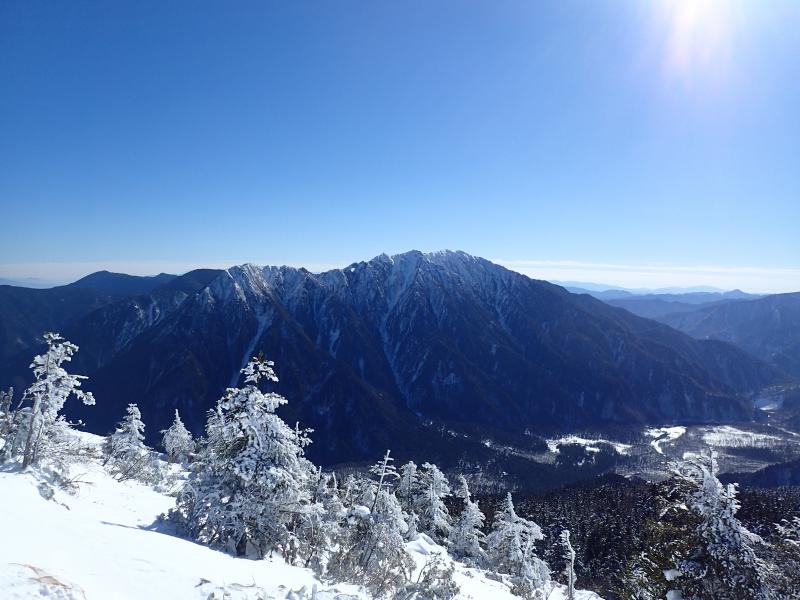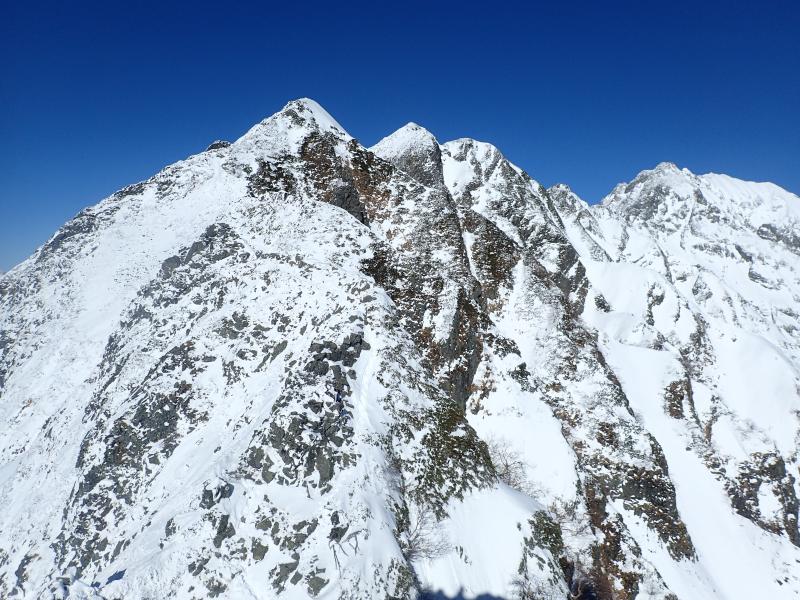 独標からは西穂へと続く岩の稜線が間近に見え、雪の北アルプスをちょっとだけ垣間見ることが出来ます。