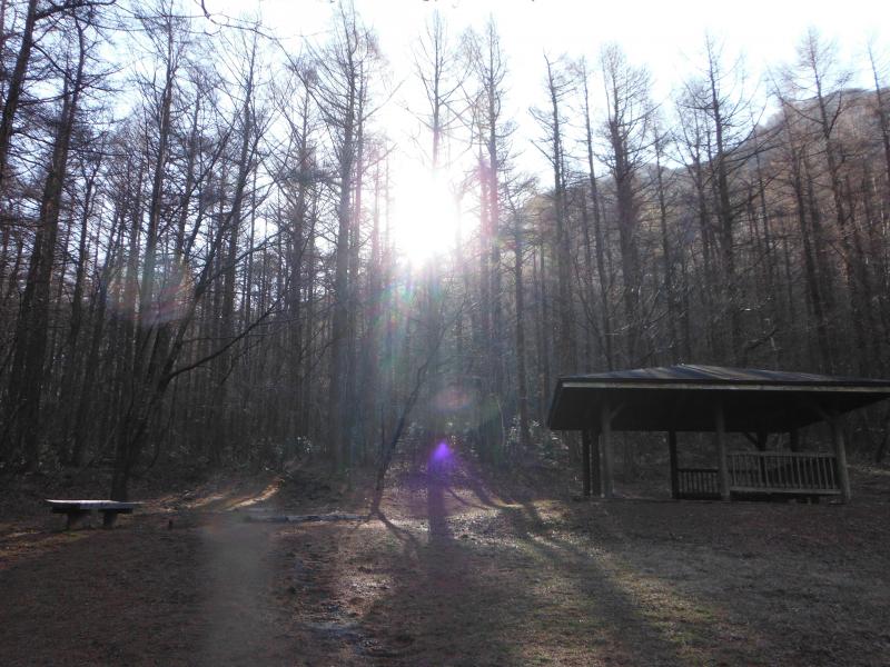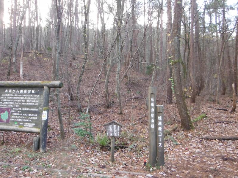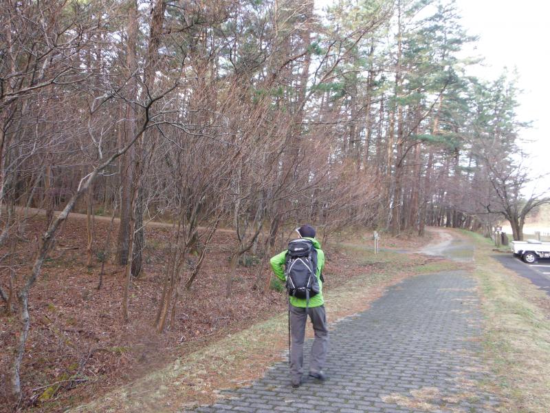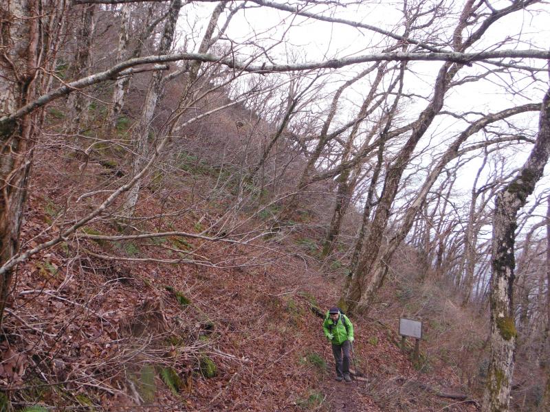男三瓶山に向かうコースは中国自然歩道なので、しばしば標識があるのですが、女三瓶山から三瓶自然館に戻るコースは分岐以外ほとんど標識がない樹林帯の中をあるきます。道なりに歩けば問題ないのですが、道迷いには注意して下さいね。ここは木々の間隔が広く、緩やかな傾斜なので雪さえ降ればスノーシューで歩くには絶好の場所にみえました。