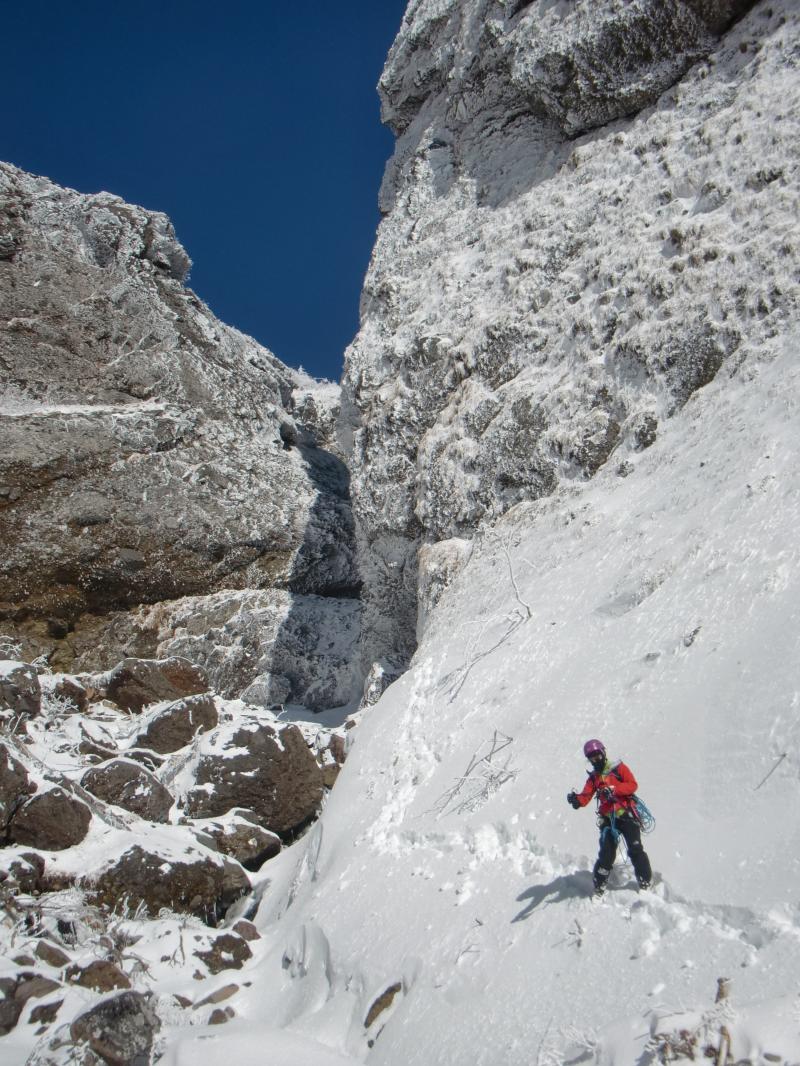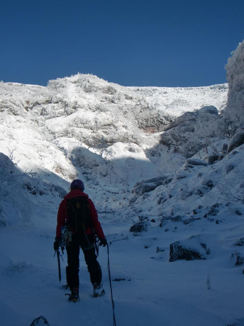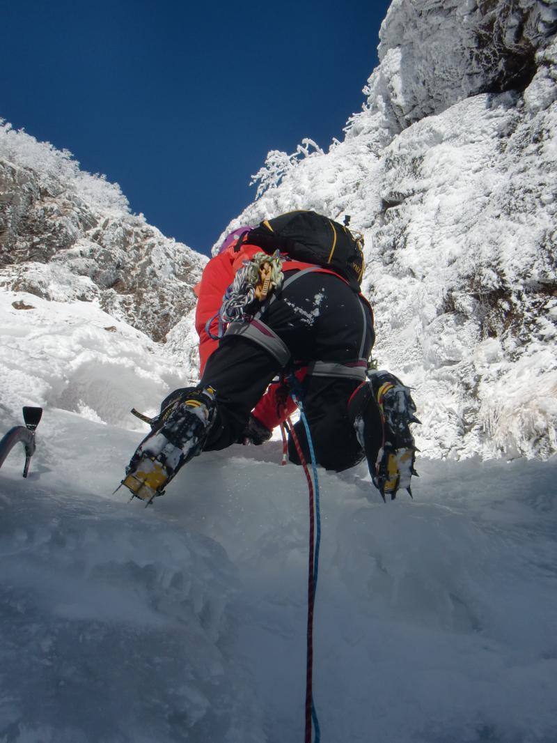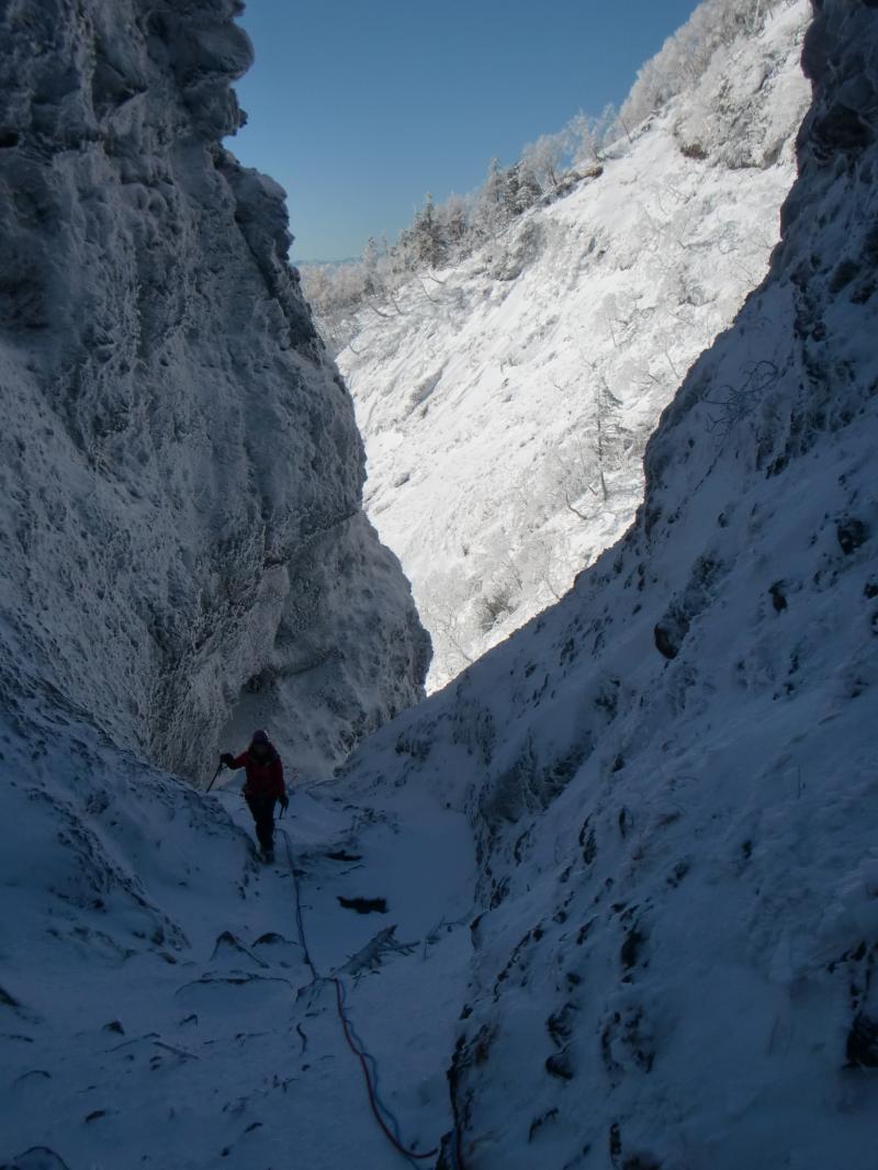 2日目はジョウゴ沢へ。なみへ〜さんとはまだ数回しかロープを組んだ事が無いので、一つ一つ確認しながら詰めて行きました。昨日の登りこみもあって、なみへ〜さん順調&楽しく登っていました。