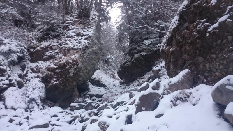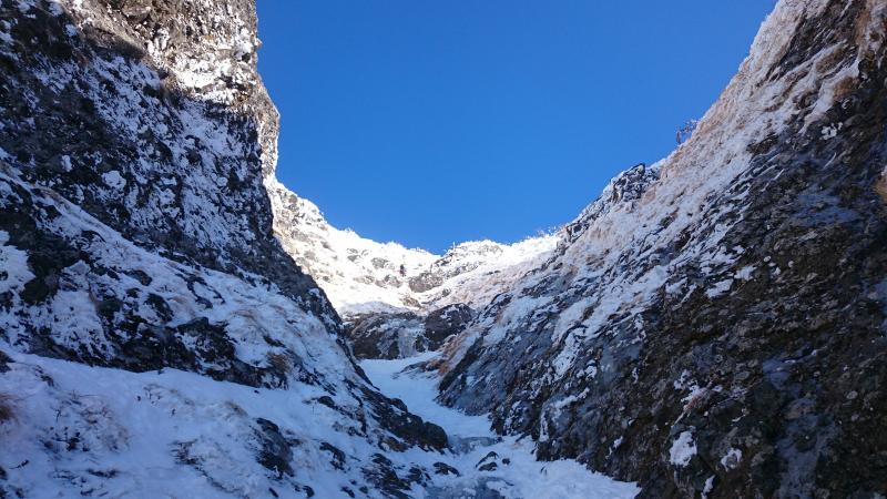 このあたりから左右から枝沢が入りますが基本的には大きい沢をつめて行けば1~3ルンゼの分岐に出る。はずだったんですが、後続のパーティにそっちは3ルンゼじゃないと言われ鵜呑みにして後をついていくと南稜へ続く稜線に出てしまいました。