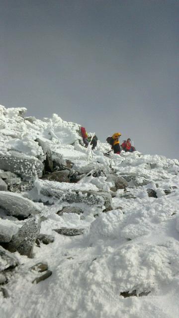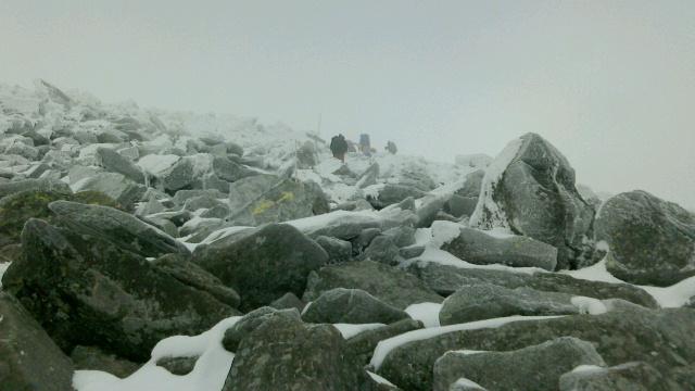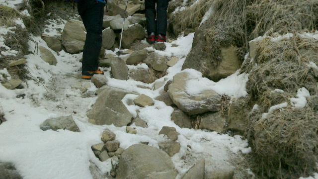 更に登るとゴロゴロとした岩の急坂です。中途半端に雪が付いているので登りにくいです。