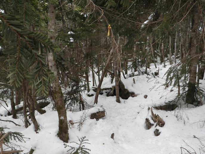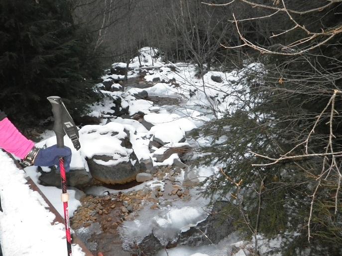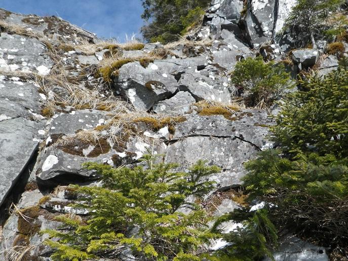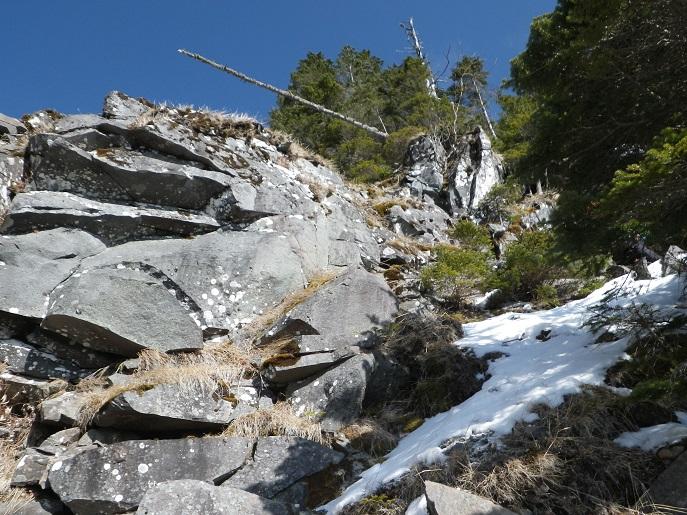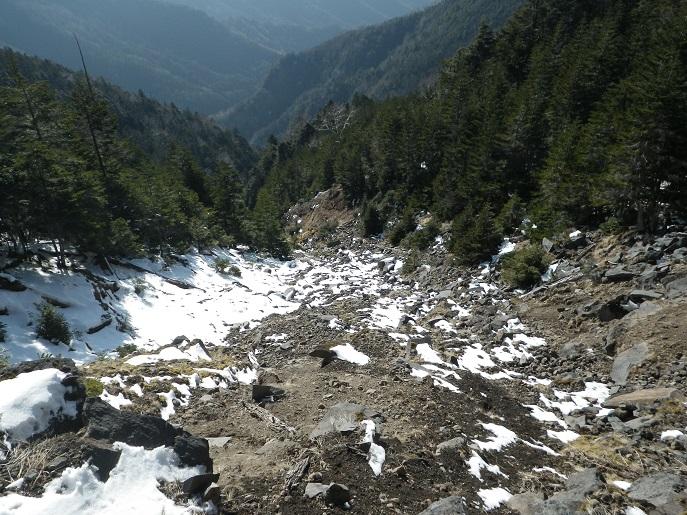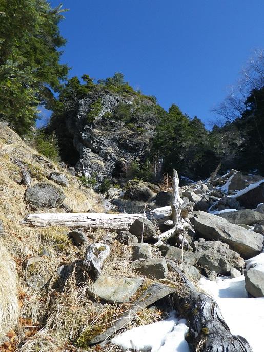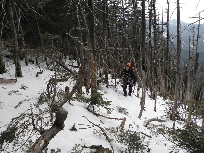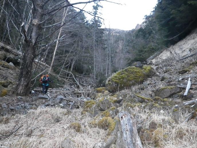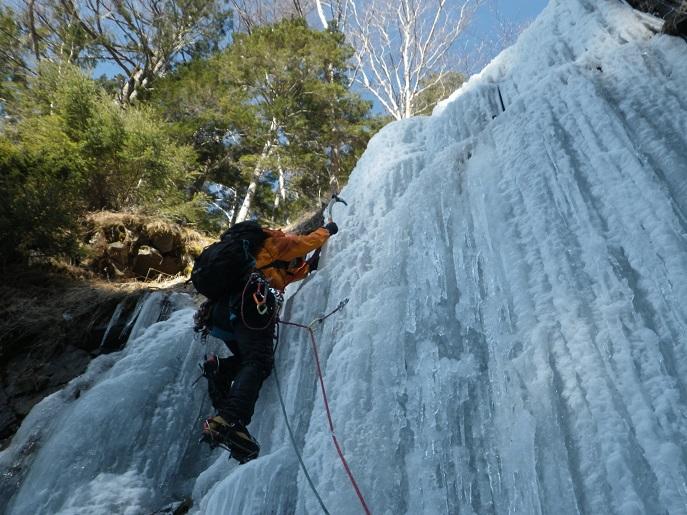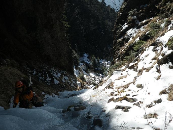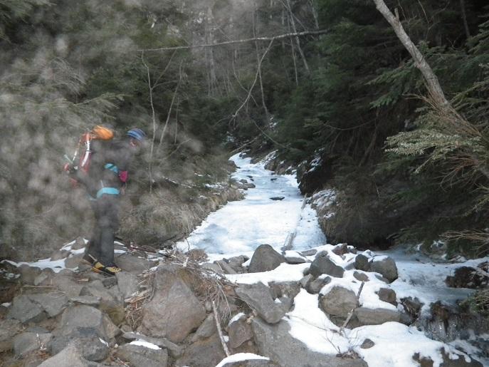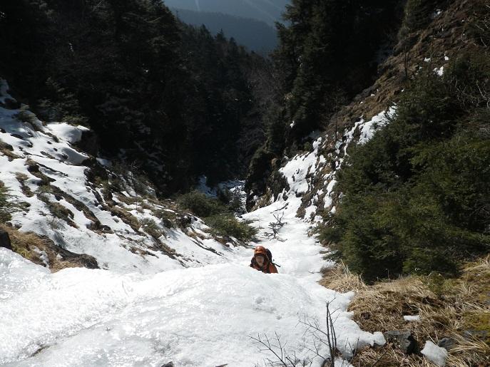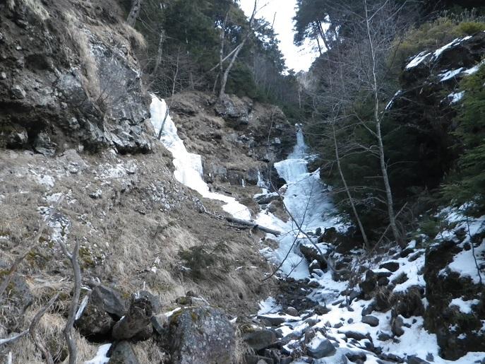 上へ抜けてなかった峰の松目沢に行ってきました。峰の松目は硫黄岳の西にあり、南西沢、南東沢が混同して記録があります。滝の数では南西沢のほうが多く、ピークに絡んで突き上げる感は軍配が上がります。アプローチは北沢堰堤から3つ目の橋を渡り、右岸を下流に向かい2本目の右に大きく開けた沢が入口です。F1はナメ、しばらく行くとF2は、正面にナメ、右真ん中に幅がある滝、右に細い滝の分岐がありますが、真ん中を登り、しばらくはナメとゴーロと易しい小滝の連続です。F6のあたりからちょっと間違うと左に入りますが、本流は右です。F8.9がハイライトですが、発達しだいでⅤ級くらいです。F2とF8.9だけビレーし、他はフリーでいきました。F12まで氷を見ましたが、陽が当たるので上部は溶けてきていました。その後は長いガレ歩きです。やがて顕著な2俣が出てきますが、左へ行けば峰の松目近くの稜線に、右へ行けば柵のような人工物があるやや離れた稜線に出ます。峰の松目から雪が少ない今回は楽でしたが、降雪後は硫黄に続く道は少々手間がかかるかもしれません。もし同ルート下降を考えるならF8あたりで降りたほうがいいようです。支点はありません。左岸の立木を使うのだと思います。捨て縄をお持ちになったほうがいいように思います。
