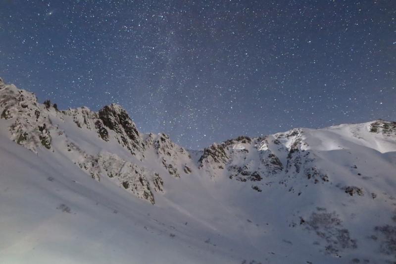難所の宝剣岳もクリアし興奮していた私はカールを一気に尻セードして下りました。(カール内は雪崩ることもあるので場合によっては控えた方が良いです)冷えた体をホテルのお風呂でほっこり温め、カールを見渡せるお部屋でまったり。うとうとしているといつの間にか外は満点の星空、翌朝は南アルプスからの完璧な御来光を見て、贅沢この上ない山旅を満喫したのでした。
