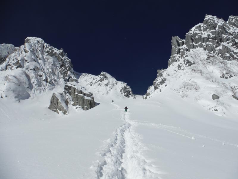 駒ヶ根市内は全く雪がないのに、千畳敷に降り立つと一面の銀世界。予報通り晴れでしたが、見上げた稜線付近は時折雪煙が舞い風が強そう。歩き始めたのはお昼近くだったのでトレースはばっちり、輝く南アルプスをバックに乗越浄土までの急登を汗だくで登りました。稜線に出るとやはり強風で一気に体が冷えてしまい、動いていないと兎に角寒いので、行動食を一口だけかじり休憩なしで中岳を目指しました。