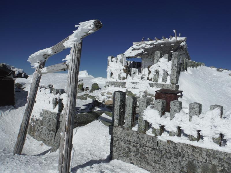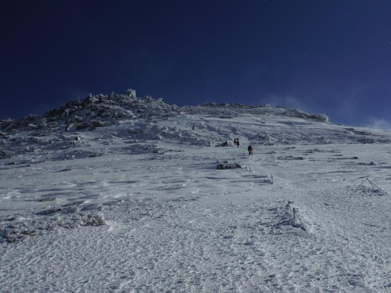 中岳まで来ると、ようやくなだらかな木曽駒ヶ岳の頂上が見えてきます。ここから一旦下り、再び登り返して山頂となります。木曽方面は生憎ガスの中でしたが、南アルプスや八ヶ岳はばっちり。強風で顔が凍りつきそうだったので写真を数枚撮ってさっさと下りました。