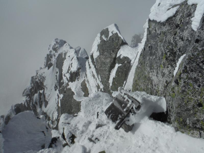 岩稜の宝剣岳は当初登る予定ではなかったのですが、時間があったので様子を見に取付まで行ってみました。雪はたっぷり付いていましたが、夏道の鎖は判断できたので思い切って行ってみることに。トラバース気味のルートを慎重に進み、最後は大岩をうんしょと乗り越えると、意外にもあっという間に山頂に着きました。残念ながらガスに巻かれて遠くの景色は見えませんでしたが、高度感が曖昧だったので恐怖を煽られずかえって良かったかもしれません。下りは一瞬足がすくみましたが、山頂で一緒になった別のグループの方がロープを張ってくれたので迷うことなく安心して下りることができました。
