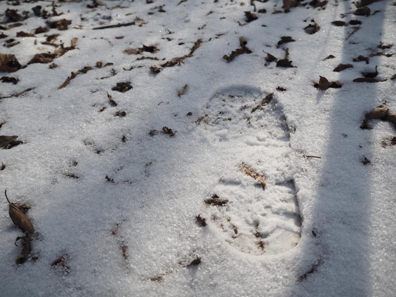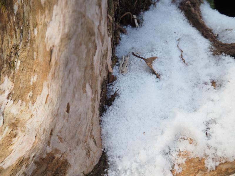 足跡がクッキリ残せるほど柔らかい。数日前に霙が朝方降ったが、山では雪だったのだろう、と思っていたら“城ノ山(846.1m)”に到着。そしてまた下り。
