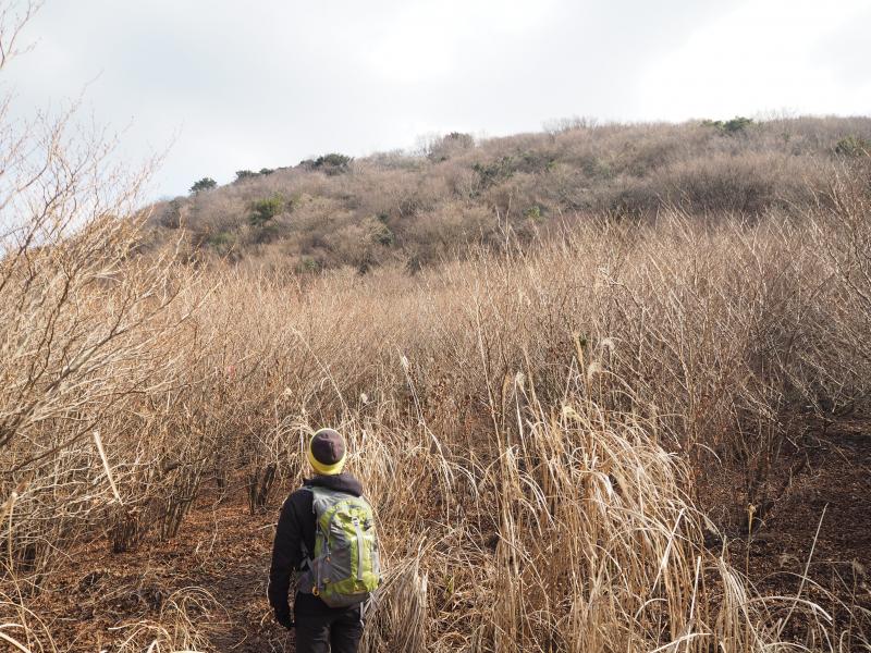 10分ほど下ると“アゴ坂峠の分岐”になり、ここから山頂まで“登山直登ルート50分”という道標に従い登る。「私もう下り坂の体になってるから登れなーい」と意味不明な独り言を全力でスルーし、赤テープとケルンを頼りに登る。一面薄らと白くなると登山道が隠れて全体が同じ様に見える。なんかどこでも歩けてしまいそうになるのだ。低山だと思ってるととんだ落とし穴にハマるので要注意。また赤テープの間隔が遠い。だがところどころにケルンがあるのでそれも目印に登って行く。