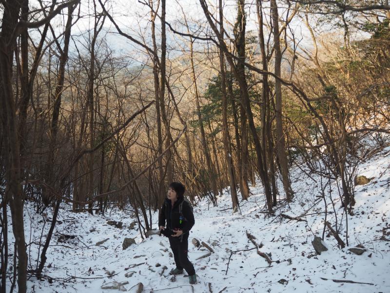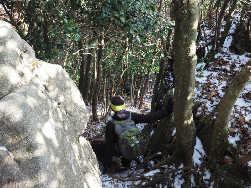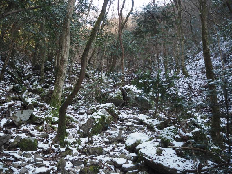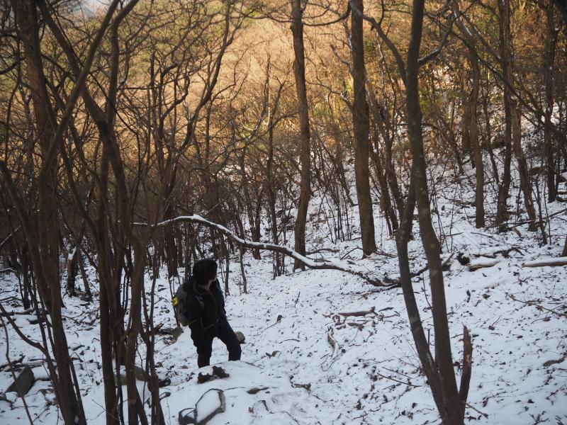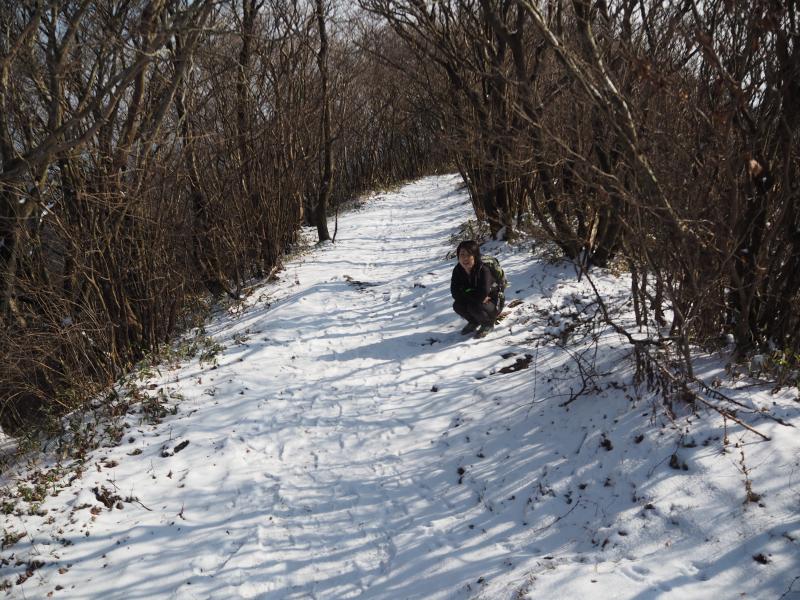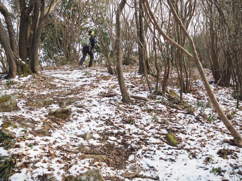 気温3℃。全く温まってない体には堪える温度。動かないと辛いから準備して、スタート。体が寒くて硬くなっているのを少しずつほぐしながら、そこそこの傾斜を一歩一歩登る。30分ほどで“三瀬山(790m)”に着く。ほどよく温まり、水分補給を済ませ、次は下り。開けた所で平坦になり、また登る。このあり辺りから登山道が薄らと白くなってきた。今年初めて見る雪だ。まぁ雪と言うより霙っぽいかな。
