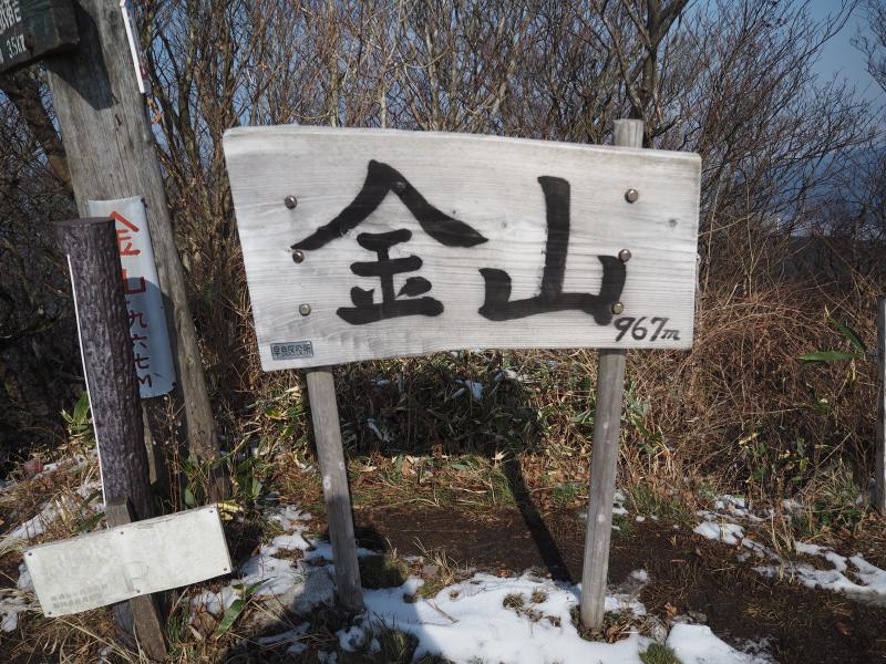稜線に出る手前くらいがちょっと傾斜がキツクなるが焦らず登り、分岐に出る。“あと100m”に従い、うにうに進むと今回の目的地“金山(967.2m)”山頂に到着。はい。お疲れ様でした。