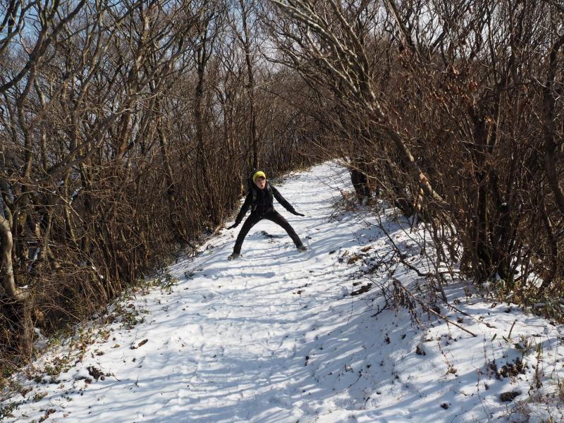 - 山頂直登ルートの道標から山頂の間は一面白くなっている状態で登山道がわかりにくいので注意が必要です。雪は薄く凍っていないので軽アイゼンはなくても登れますが、下る場合は滑らないよう注意してください。状態にもよるので軽アイゼンは装備にいれましょう。