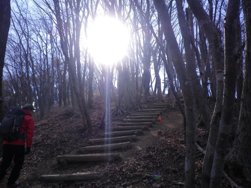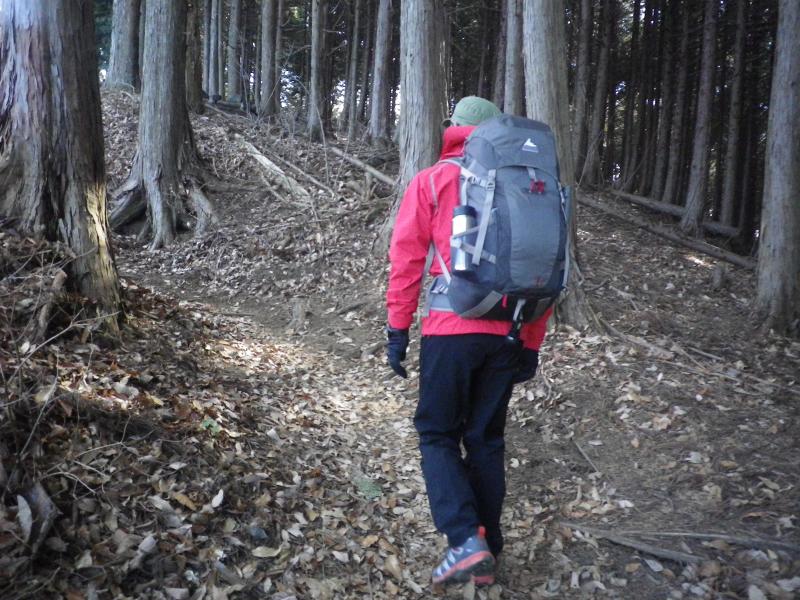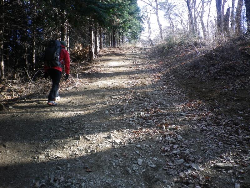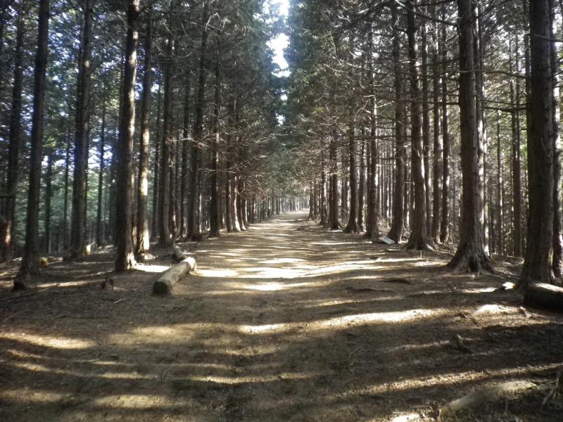 しばらく畑や車道を横切ると登山道に入りやや薄暗い植林帯が続いたのちに明るい尾根道出ます。