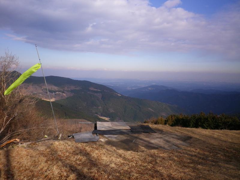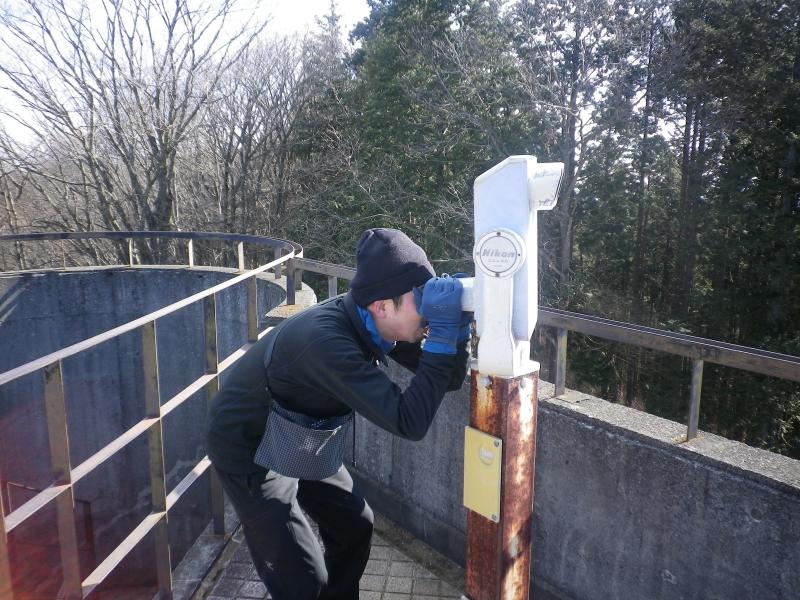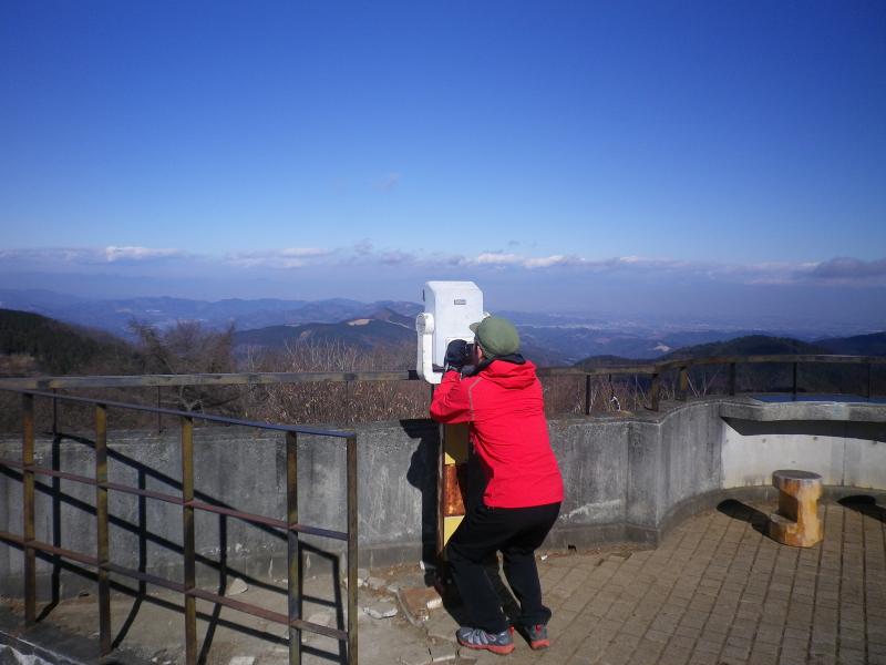 ここから傾斜がきつくなりますが登山道を振り返ると開けた場所から景色を楽しめます。その後車道を横切り更に進み、県民の森を過ぎて細かい急登を過ぎると要塞のような展望台が現れ山頂に到着します。
