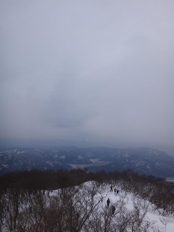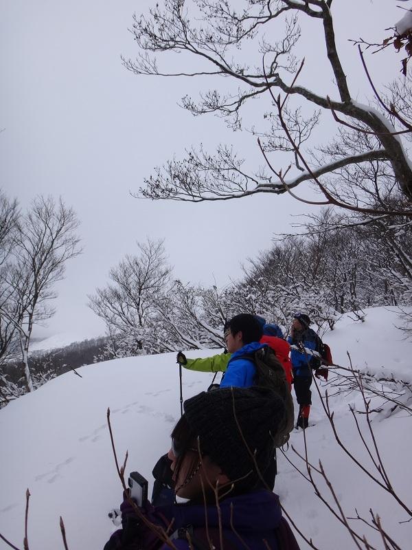 寒風から折り返し、復路では広い尾根沿いで皆様思い思いのトレースを引き、