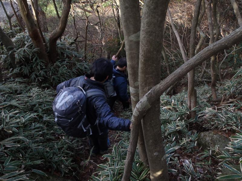 - アプローチは落ち葉の中を、ややアップダウンを繰り返す、細い登山道です。いくつも滑っている跡があるためさらに滑りやすくなっていました。根っこや岩を手で掴みながら下ると楽です。両手はしっかり開けている方がいいです。