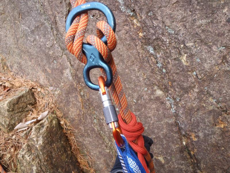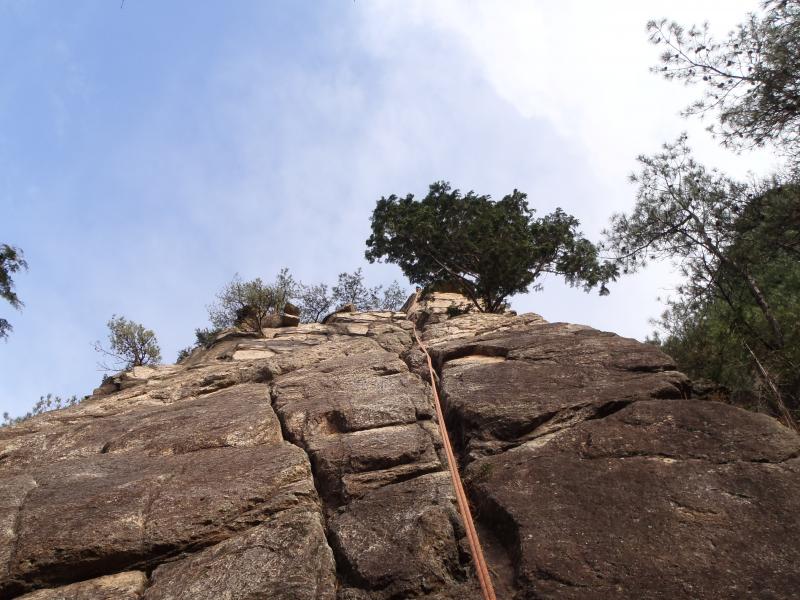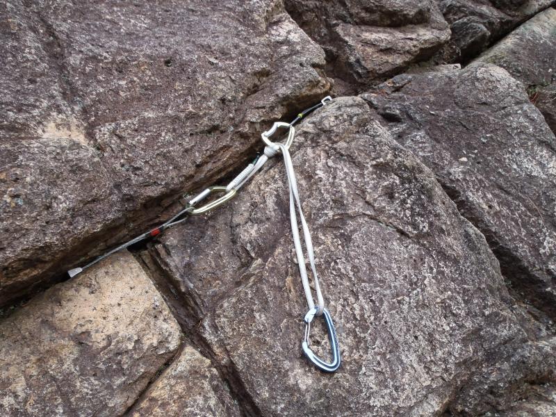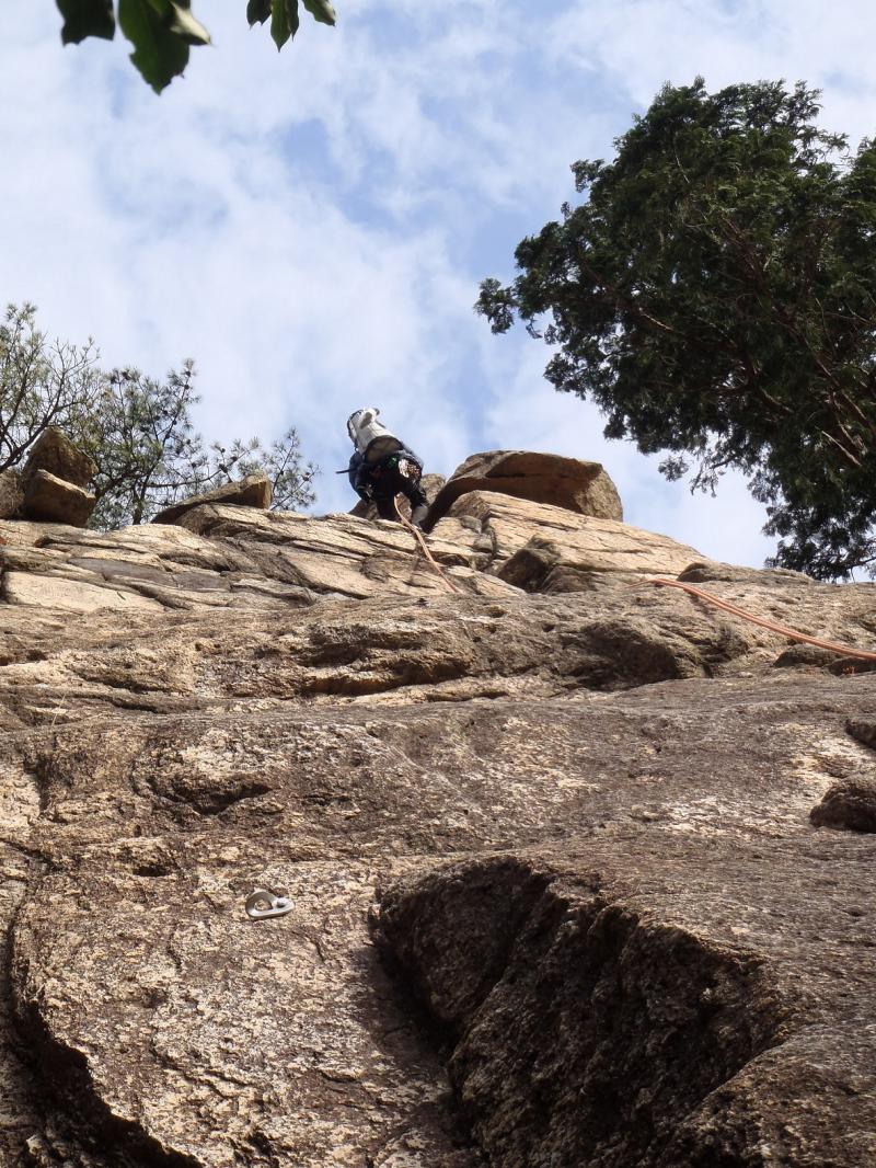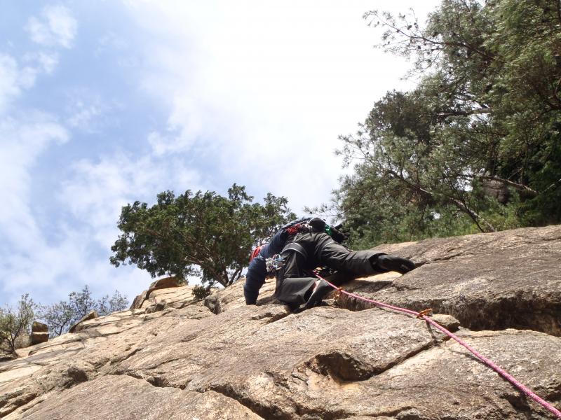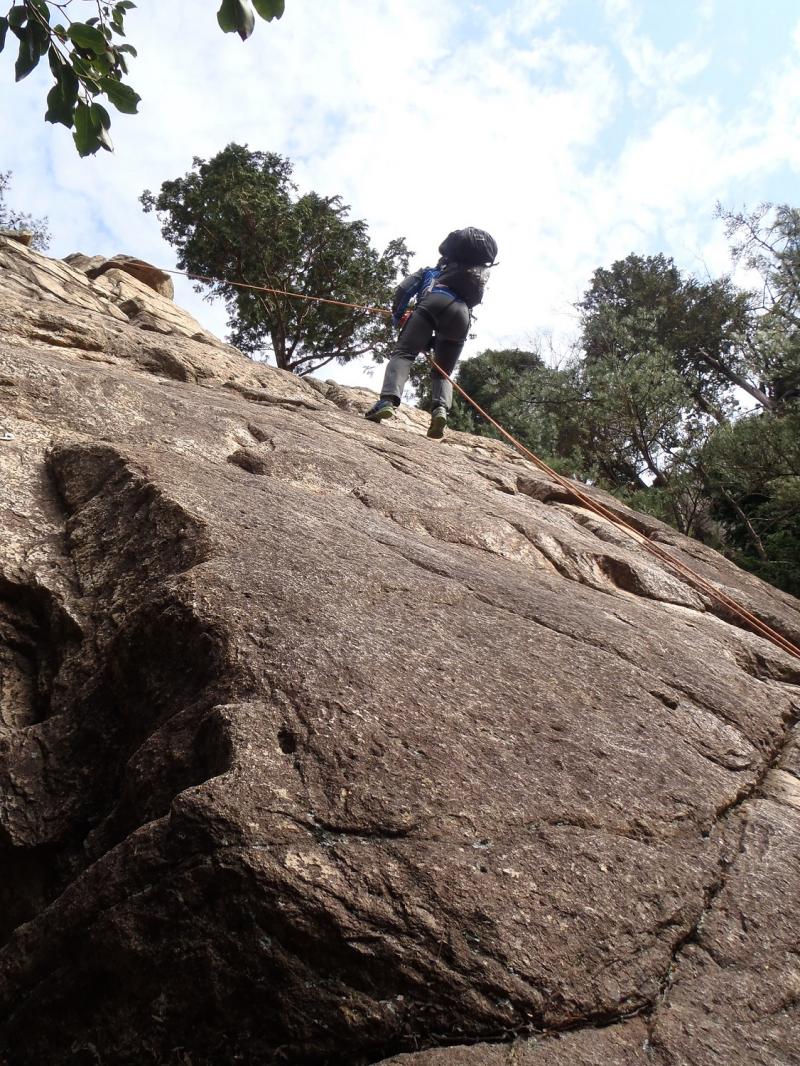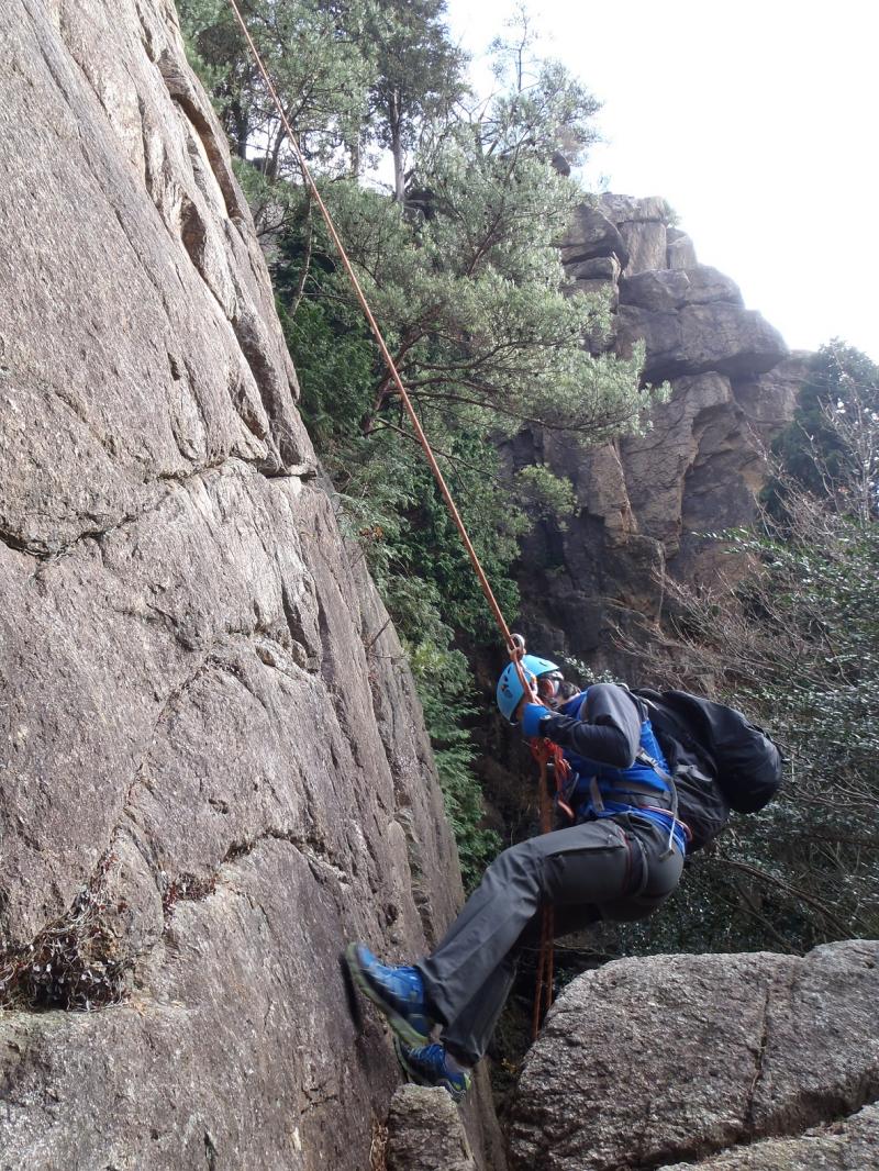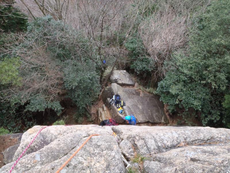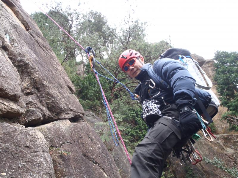 カム等の設置は大角さんが、私は次に登り、セカンドの白井さんの引き上げを担当。システムの復習を主に行って、一つ一つの動作を確認していきました。