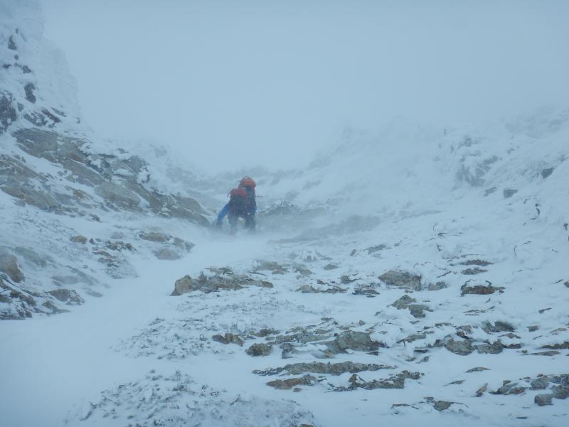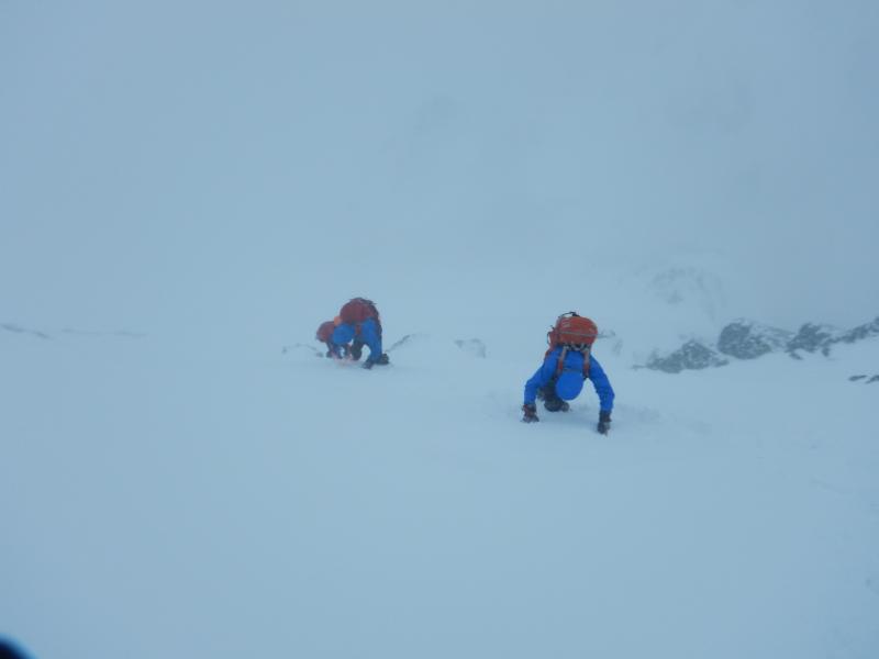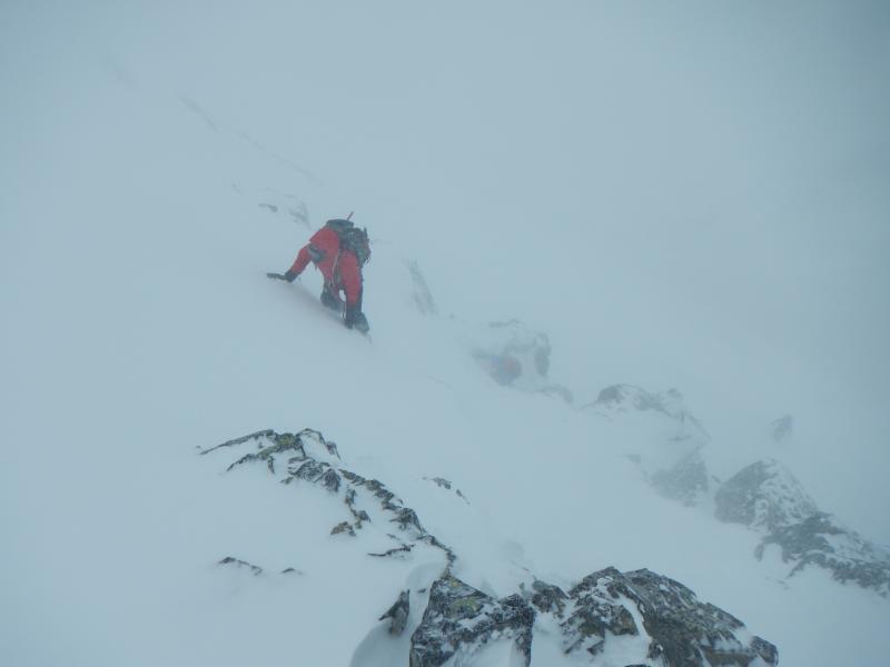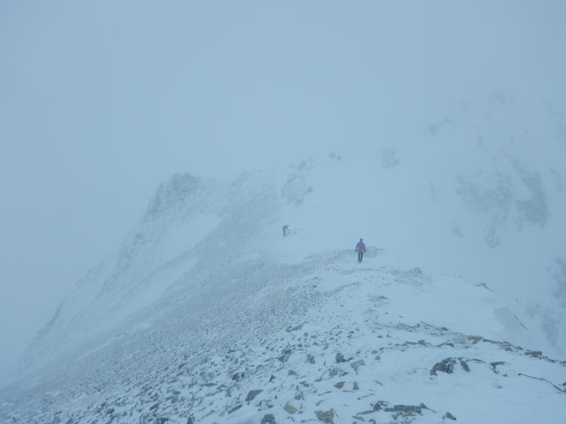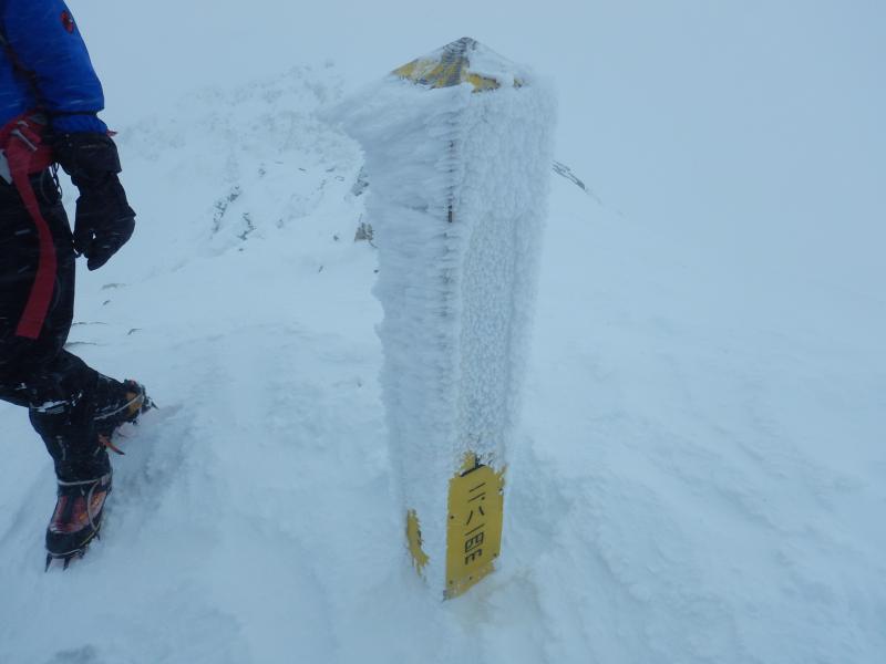五竜山荘から山頂までは、とにかくトラバースです。上に行き過ぎると岩峰で行き詰ります。細かい雪が強風でゴーグルの中にまで入り込み、見えないからとゴーグルを外せばまつ毛が凍り。大変でしたが厳冬期の後立山を満喫できました。