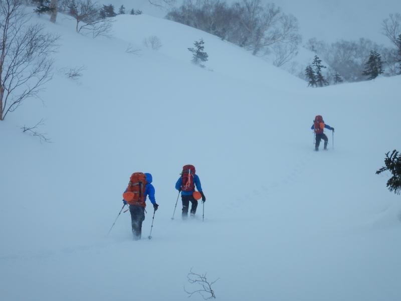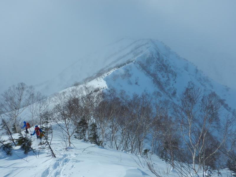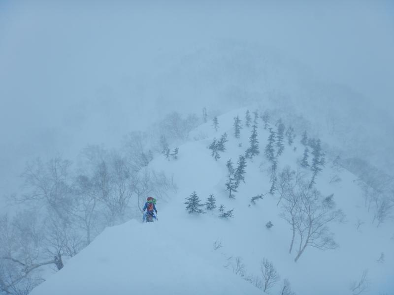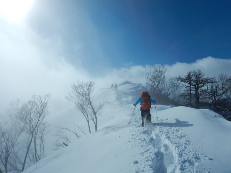例年より雪庇が小さめで危険は少ない。尾根の途中で雪庇の向きが逆になっている個所もあるので、今後の雪庇の発達具合によって難しいところがあるかもしれない。ラッセルはワカンで膝程度。時々腿ラッセル。