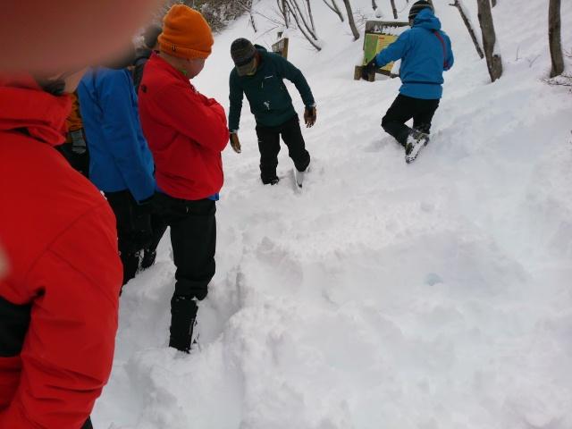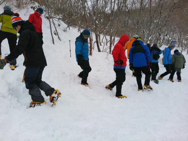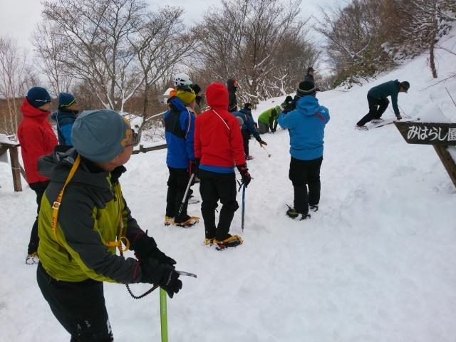 いざスタート‼まずは、アイゼンなしのいわゆるつぼ足で始まりました。アイゼンばかりに頼らない、大事な訓練です。登山指導所に着いてから本格的な講座の始まりです。雪上での歩行技術、アイゼンの装着方法、ピッケルの持ち方、使い方、最後に1人ずつ滑落停止を体感して頂きました。