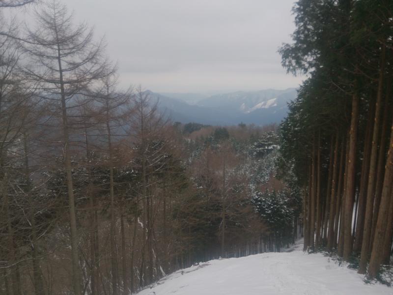 すると尾根が開けて、防火帯になります。この辺りからアイゼンをつけると良いでしょう。しばらく歩くと、急登があります。ここで振り返って景色を見ると晴れていれば都心まで見えそうな感じでした。急登が終わるとコブタカ山の分岐になり、そこから20分ほどで本仁田山です。