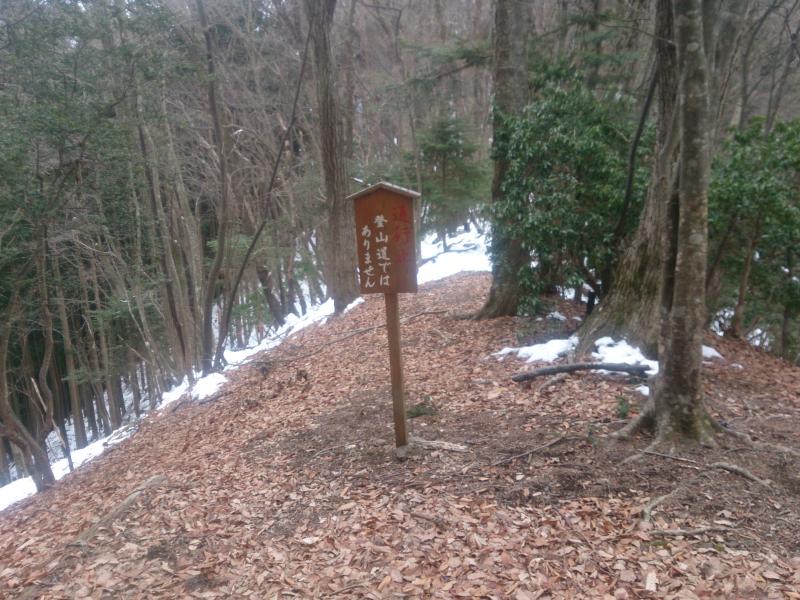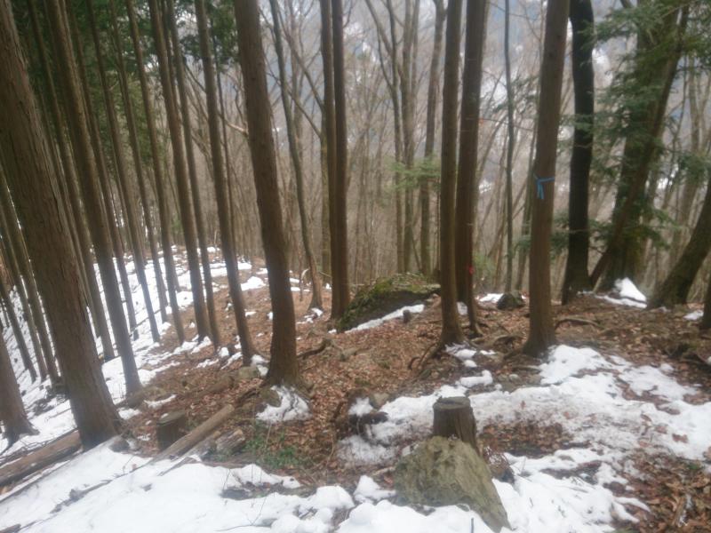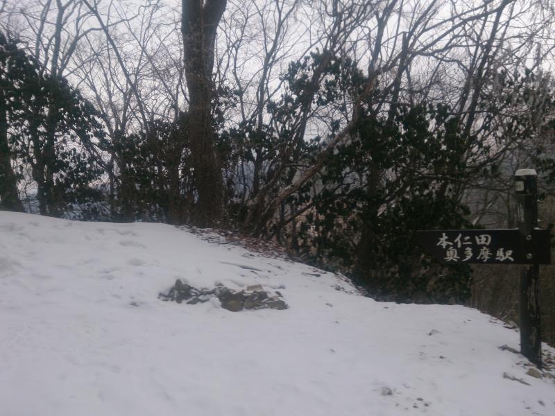 鳩ノ巣駅から大根ノ山ノ神を過ぎた辺りまでは雪が少なく、アイゼンは必要ありませんでした。そのまま進んで、本仁田山と川乗山との分岐を過ぎ、本仁田山方面に少し行くと雪が多くなってきます。