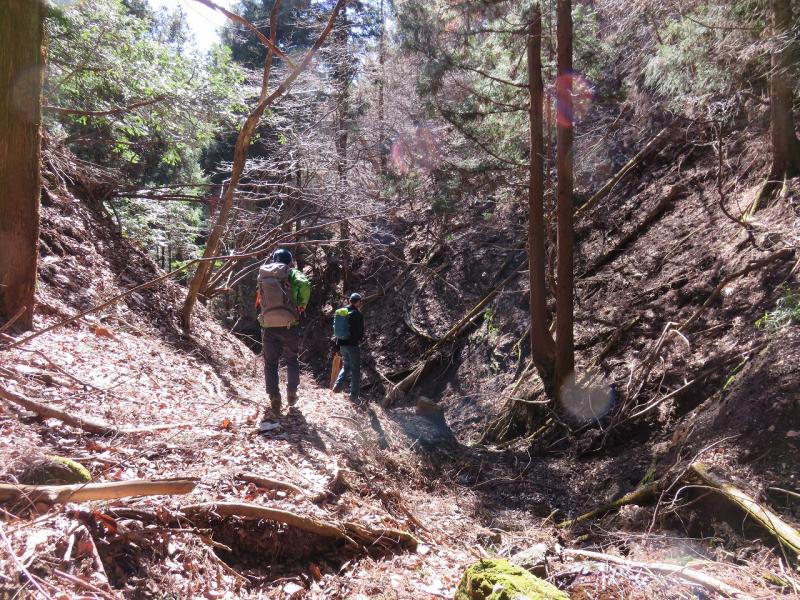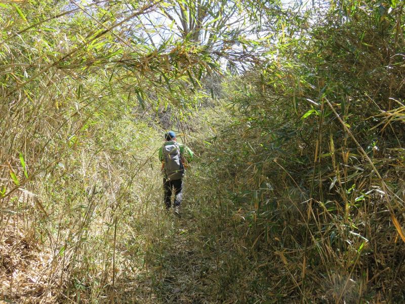 下りのルートは、地図上では破線ルートとしてしっかり記載されていますが、倒木や笹藪が多々ある関係で、踏みあともあてにならないような道でした。