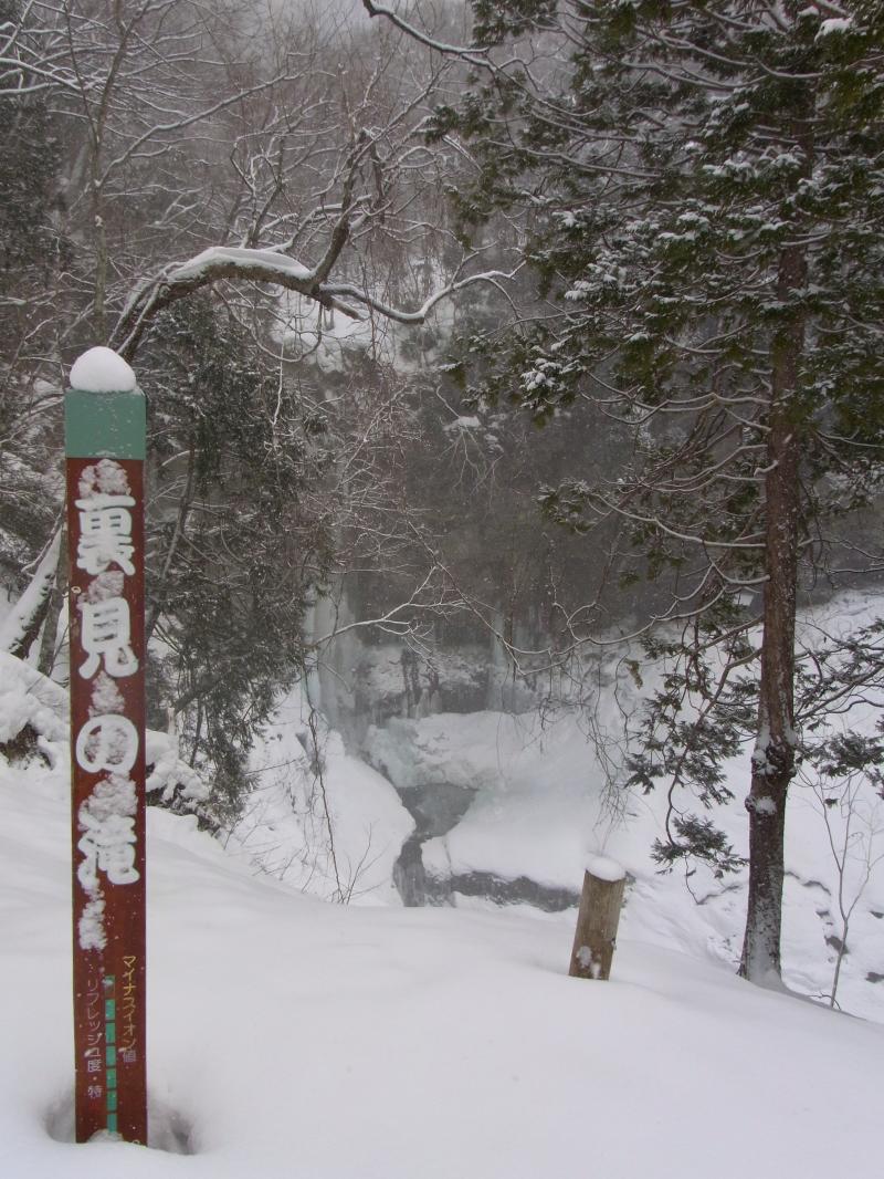 裏見の滝は看板よりさらに下っていった先にあり、全体的には凍っていたが半分水が流れ落ちていた。階段より下には行けなかったけれど大きく迫力があり、一同記念撮影をして時計を見ると13時10分。リフトの最終は16時前後、できれば15時半までには戻りたい。さらに帰りの道は下ってきた道を登り返さなくてはならないため、ここでゆっくりしている時間はどう考えてもなかった。