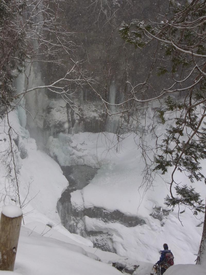 けっこう雪が降っていたのと、スキー場の裏なので目的地までの道標などがキャンプ場まではまったくなく、分岐のたびに地図を見たり、ソリをしたり、コースを外れたりしていたらあっという間に13時近くになり、滝は見ることができるのか?という空気が濃厚になってきた。スマホのGPSで確認するともうすぐ滝のはずだし、水が流れる音がしてきたということで、みんなお腹をすかしていた様子だったが気合いで滝の看板前に到着。