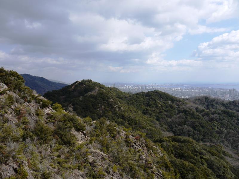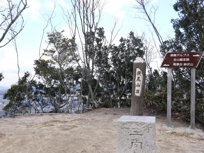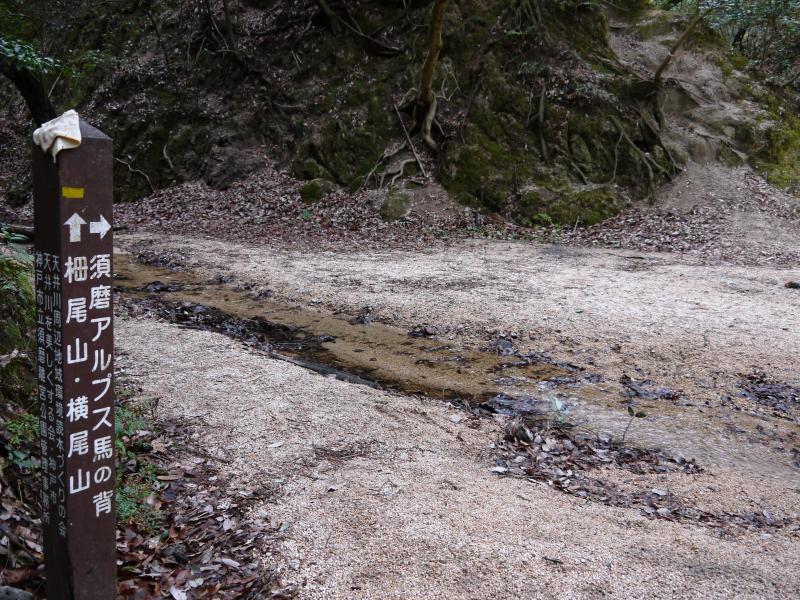 - 山陽電鉄月見山駅(15分)須磨名水の森(8分)一つ目の分岐(30)支尾根合流点(25)馬の背(10)東山・Uターンして(23)横尾山頂上(15)栂尾山(20)離宮公園上部(26)離宮公園正門