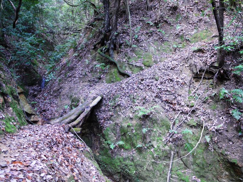 ・月見山駅から「須磨名水の森」入口まで徒歩10分強で、頭上には第二神明有料道路がありますが森に入ると静かで陽射しも遮るので山奥に来たかのようです。今日は一つ目の分岐を途中まで右に進み、左手に支尾根へ続く踏み跡をたどり横尾山の南東側へ出るルートを使いました。冬は虫もヘビも出ないので快適です。