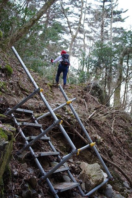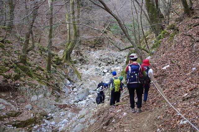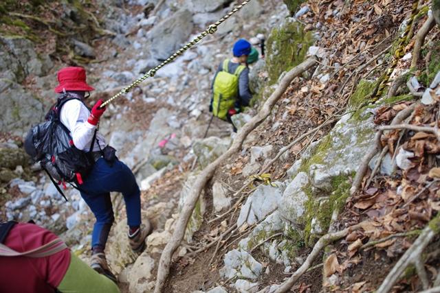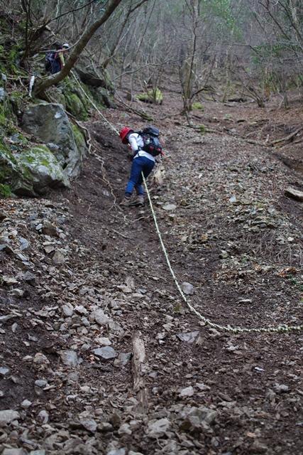 涸谷沿いに登っていきますが、最初からロープの張ってある急な斜面を登ります。