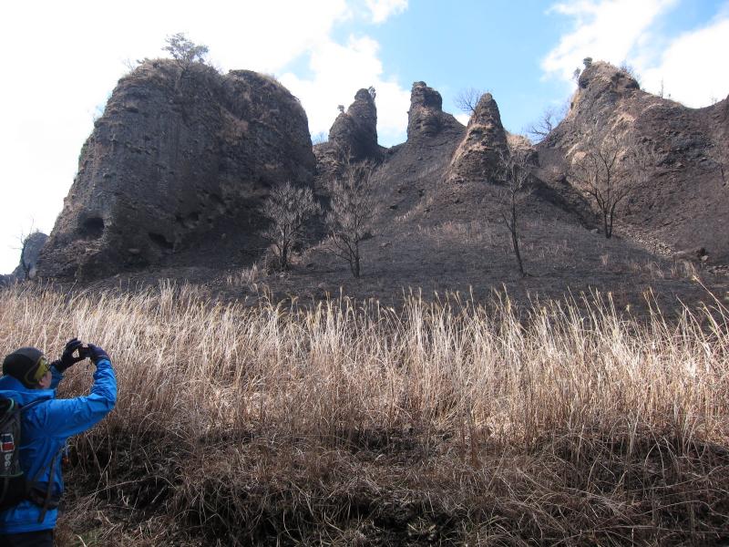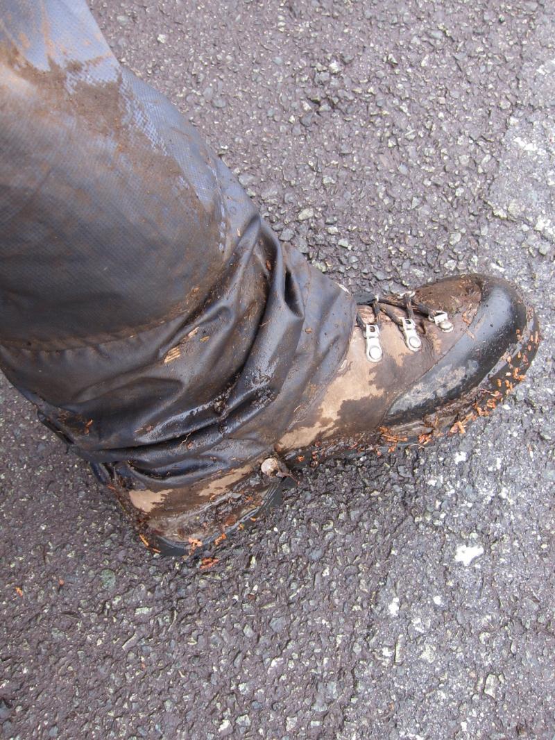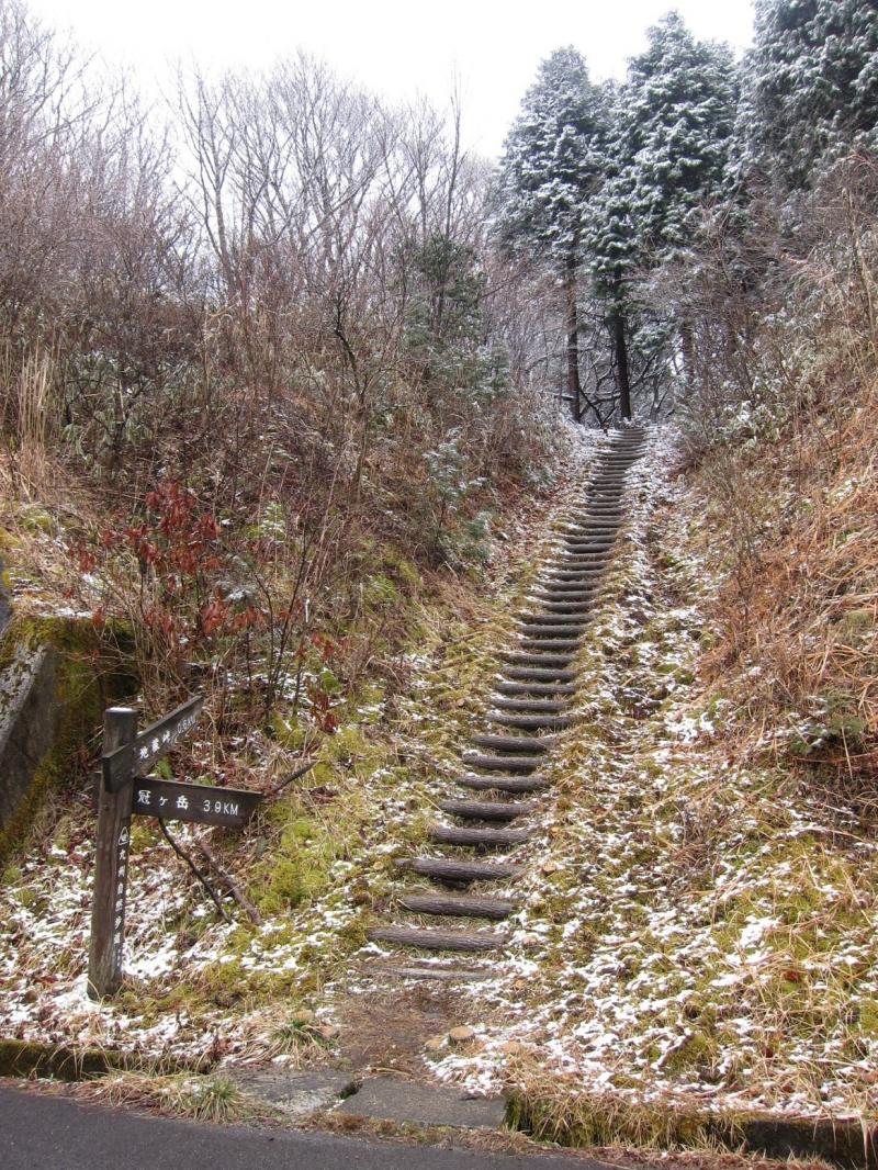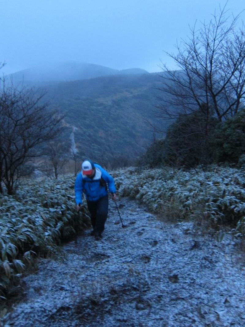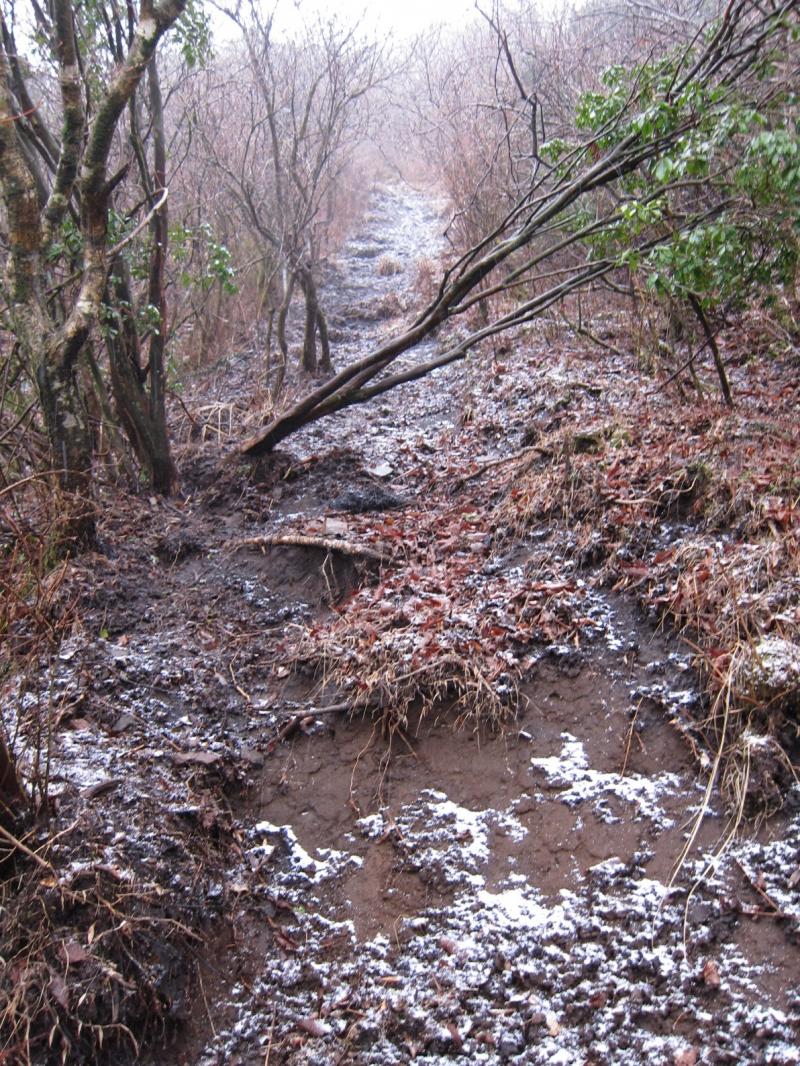 距離は短いながらも急斜面が多く、黒土がドロドロでとても滑りやすい。スパッツ必携。フラットフッティングで踏ん張りながら、慎重な体重移動で少しづつ登りました。